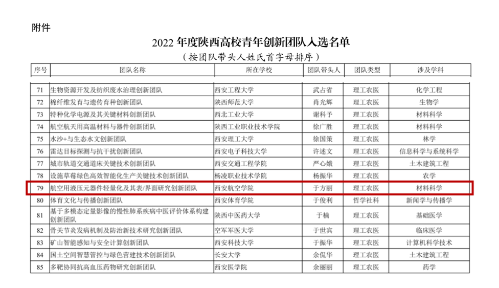 近日,陕西省教育厅发布了《关于公布2022年度陕西高校青年创新团队入选名单的通知》(陕教函〔2022〕943号),taptap点点taptap点点官方网站于方丽教授带领的“航空用液压元器件轻量化及其表/界面研究创新团队”成功入选2022年度陕西高校青年创新团队,这是taptap点点团队首次入选陕西高校青年创新团队,实现了学校在该领域的历史性突破。