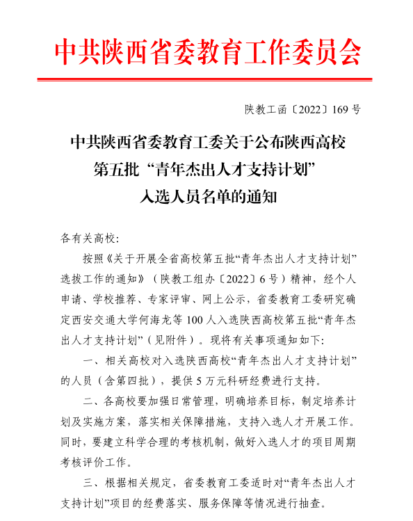 陕西省高校“青年杰出人才支持计划”由中共陕西省委教育工委组织申报。项目从2017年起每年评选一次,旨在用五年时间,储备属于省内领先、国内有一定影响力的高层次学科专业人才力量,为进入国家和省(部)级人才计划打好基础。