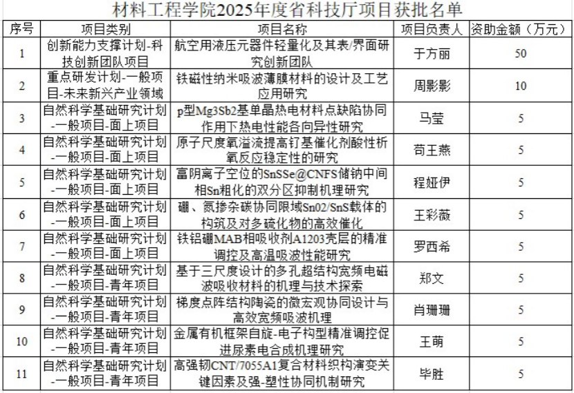 近日,陕西省科技厅2025年度科研项目立项结果正式公布,taptap点点官方网站喜获佳绩,共获批项目11项,占全校立项总数的三分之一,创历史新高。此次立项不仅包含全校首个“科技创新团队项目”,还涵盖1项重点研发计划及10项自然科学基础研究项目(含6项面上项目、4项青年项目),覆盖航空材料、纳米技术、新能源和催化等前沿领域,标志着学院科研水平全面提升,为学科建设与学校发展注入强劲动能。