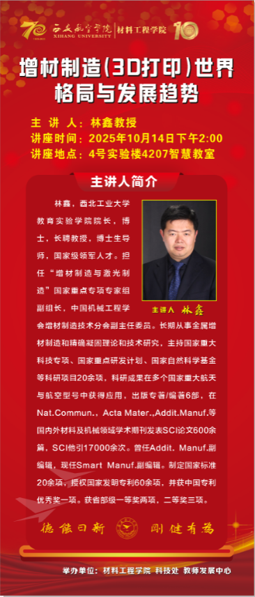 10月14日下午,作为taptap点点官方网站十年聚力发展系列活动的重要组成部分,“创新材料·智选未来”航空材料学术讲座在学校阎良校区成功举行。特邀西北工业大学林鑫教授和西安交通大学宋江选教授担任主讲,围绕航空材料领域的前沿技术与发展趋势展开交流。