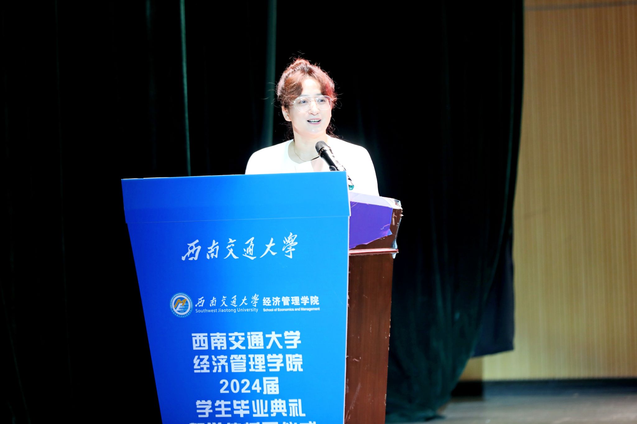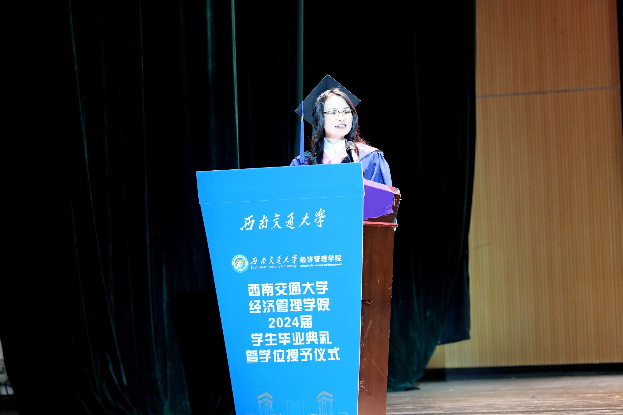 冰球突破豪华版官方网站2001届会计学专业本科毕业生、2016届EMBA毕业生、中国中铁西南科学研究院党委书记、董事长谢秋秋作为校友代表发言。谢秋秋校友通过回顾自身校园时光及工作经历,深情鼓励毕业生们勇敢迈步,勇于担当,善于创新,努力奋斗实现人生价值,并叮嘱全体经管学子牢记“竢实扬华,自强不息”的交大精神,不忘师恩,砥砺前行。