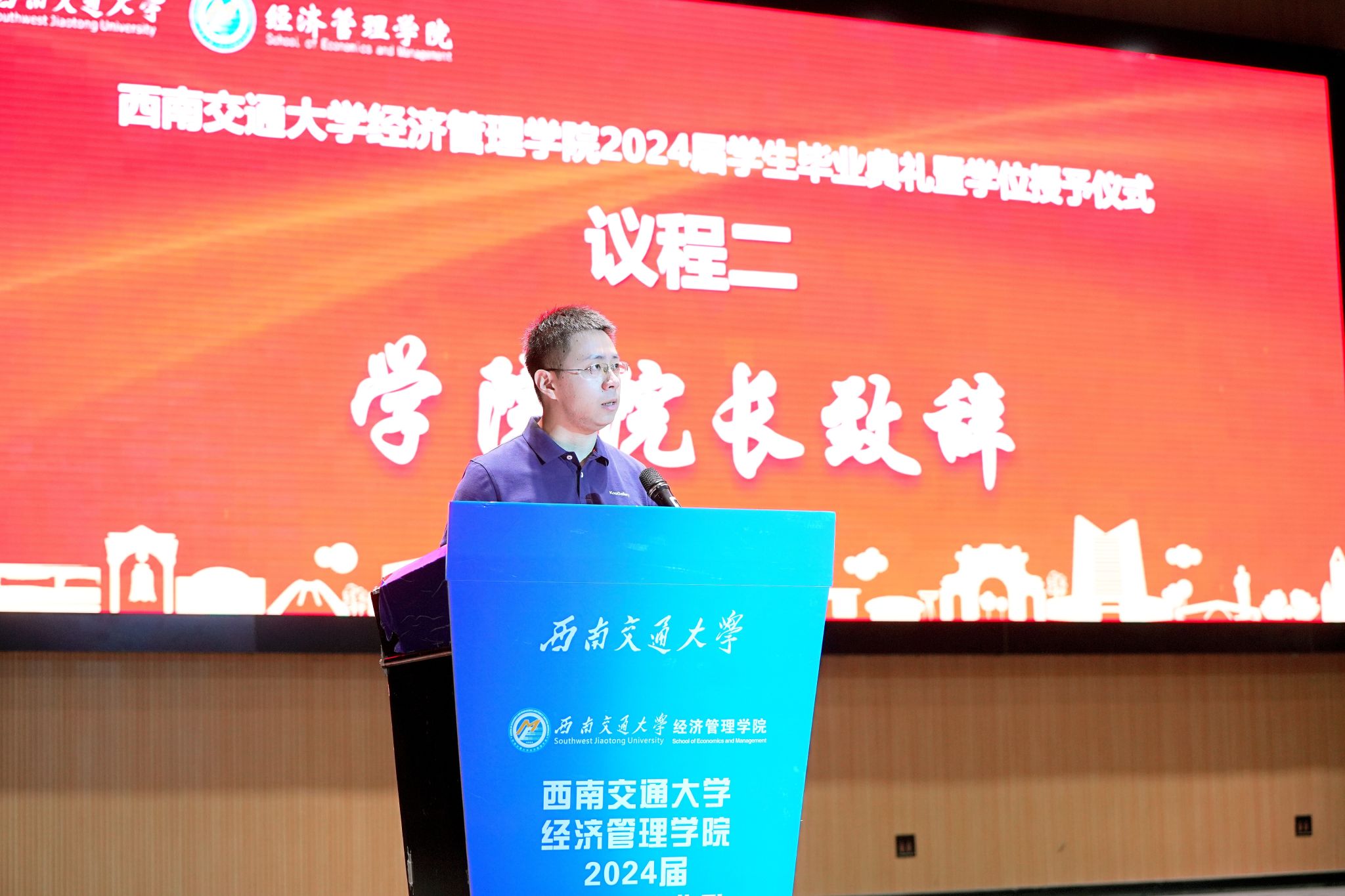 首先,学院院长韩科为典礼致辞。他代表冰球突破豪华版官方网站全体师生,向全院2024届毕业生表示热烈祝贺,并对他们在学院学习期间所取得的成绩给予高度认可。临别之际,他强调,希望同学们时刻谨记校训、院训,发扬交大精神,展现交大学子的担当。同时,韩院长为毕业生们提出了三点建议:一是提升境界的高度,二是拓展胸怀的广度,三是加深信念的深度,希望毕业生们带着学院的关心关怀,无惧风雨,奋勇前进,学院永远是经管学子们温馨的家。字字句句间,都寄托着对全体毕业生的深情嘱托与美好祝愿。
