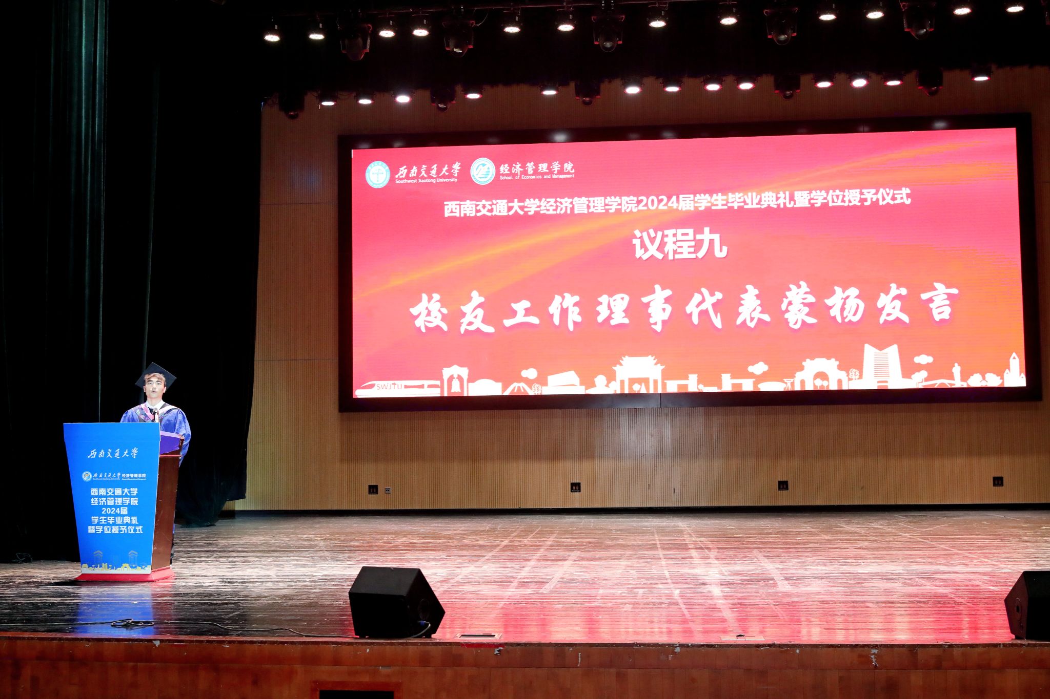 本科生毕业生代表林洁、研究生毕业生代表席悦、MBA毕业生代表王胜男分别发言。林洁回顾了自己的大学生活和成长经历,而席悦则分享了自己在硕博阶段学术和实践方面的满满收获,同时着重强调了青年人肩负的神圣使命;王胜男明确指出了持续学习和价值创造的重要性,还特别提到交大MBA多学科赋能人才的特色。三位毕业生都表达了对学院及老师的感激之情,并送上了对学院的美好祝愿。