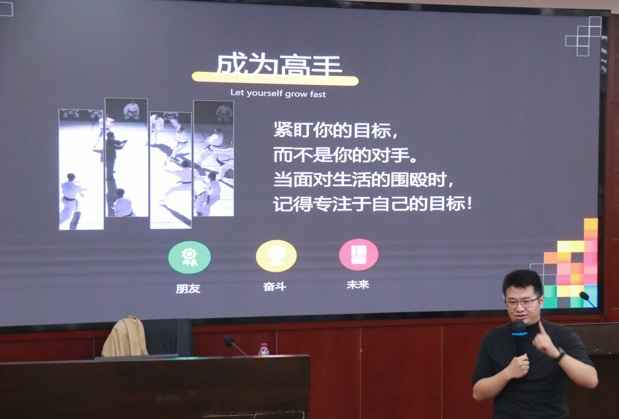 最后,刘士豪引导新生们思考对未来的发展规划,提醒大家要善用大学时光,为将来的职业生涯奠定坚实的基础。他的分享不仅激励了在场的新生,也促使新生开始认真思考自己的大学生活和未来方向。