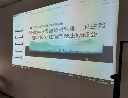 2021年4月20日,冰球突破豪华版官方网站2018级信息管理与信息系统专业开展组织了一场简短而重要的班会。主题是学习学生公寓管理办法、校外住宿管理办法、宿舍卫生管理办法。本次班会的主持人是管信二班的生活委员穆青松,由他在讲台上展示PPT并讲解。