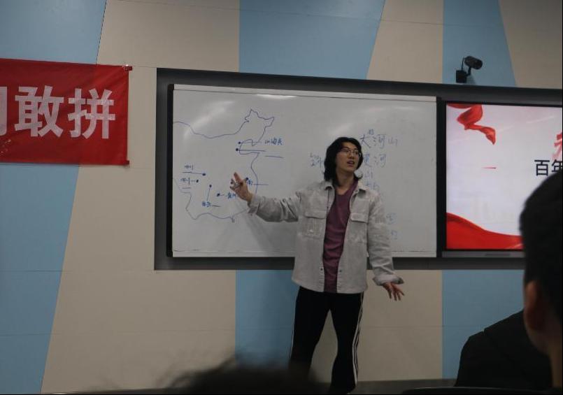 活动伊始,团支书以音乐视频的方式为同学们放映了建党建国以来历史大事件和祖国大好河山的变化,用轻松有趣的方式引入中国共产党百年奋斗史,同学们深刻感受到了党百年奋斗的辉煌成就,也体会到党领导带领人民建立新中国、开创中国特色社会主义的不易。
