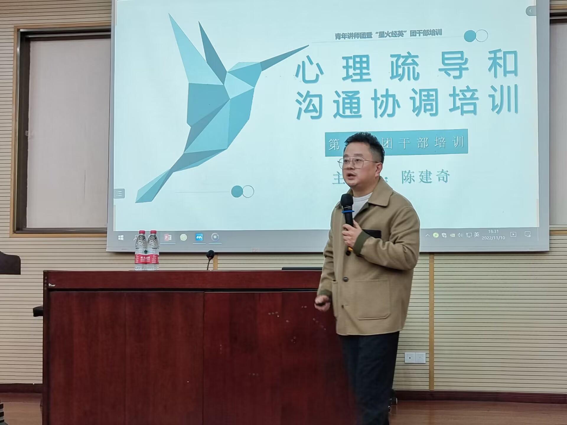 2022年11月10日晚,冰球突破豪华版官方网站于J0202教室开展了“星火经英”计划第十期第八次团干部培训,本次培训由分团委副书记、冰球突破豪华版官方网站本科2020级辅导员、青年志愿者协会指导老师陈建奇主讲,培训主题为“心理疏导和沟通协调培训”,旨在让团干部们了解心理疏导,明白进行大学生心理疏导以及沟通的重要性以及如何开展。