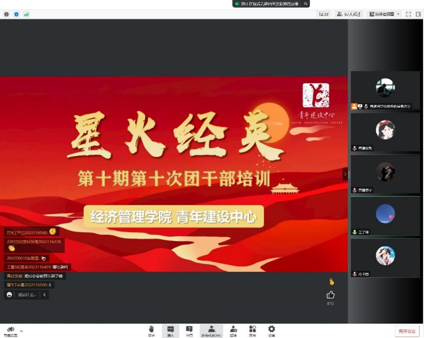 2022年11月24日下午,冰球突破豪华版官方网站于线上开展了“星火经英”计划第十期第十次团干部培训,本次会议由2022级辅导员王子琦组织, 2021级博士研究生冷书恒主讲,培训主题为“增强实现中华民族伟大复兴的精神力量”,旨在激励同学们弘扬伟大建党精神,争做新时代先锋力量。