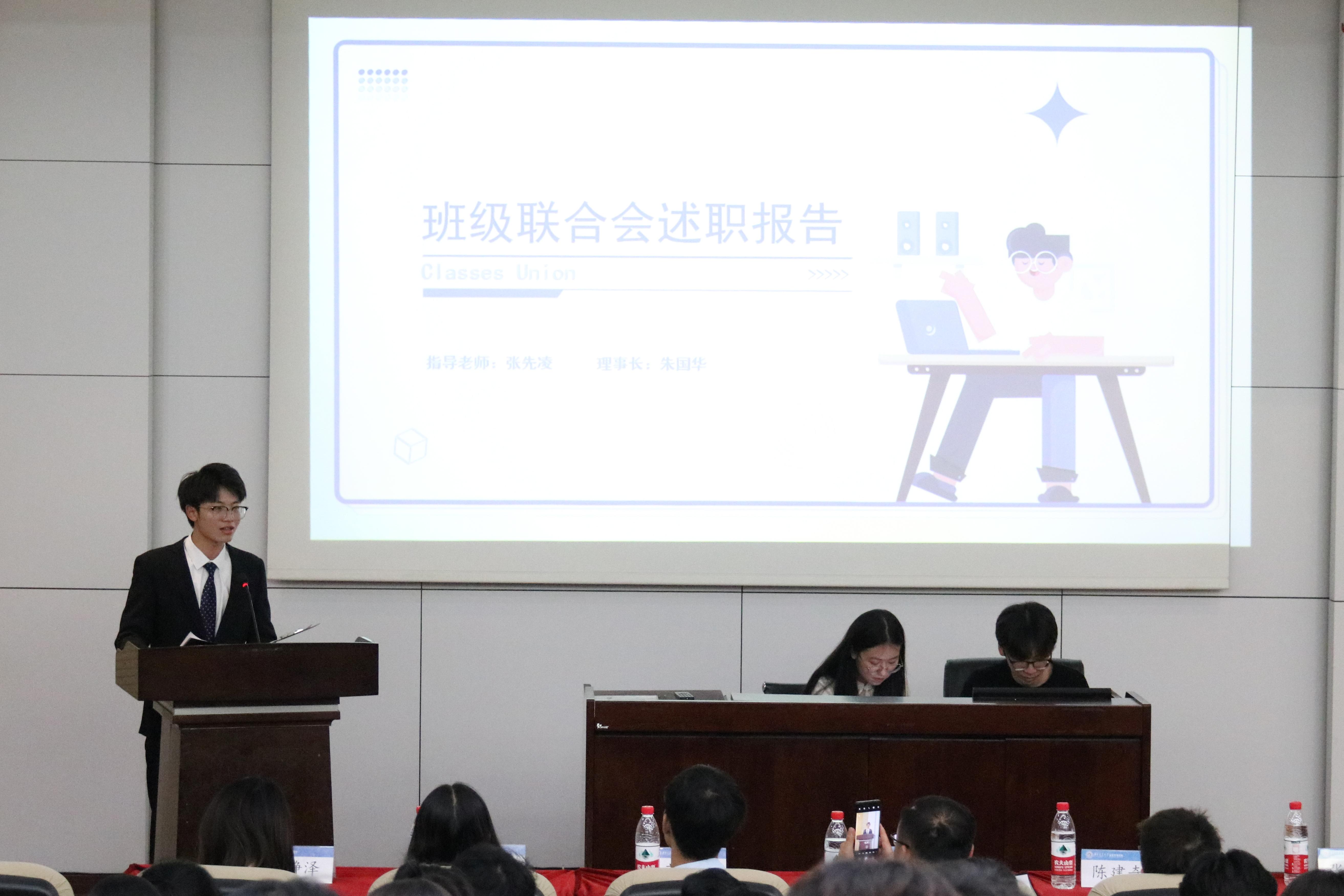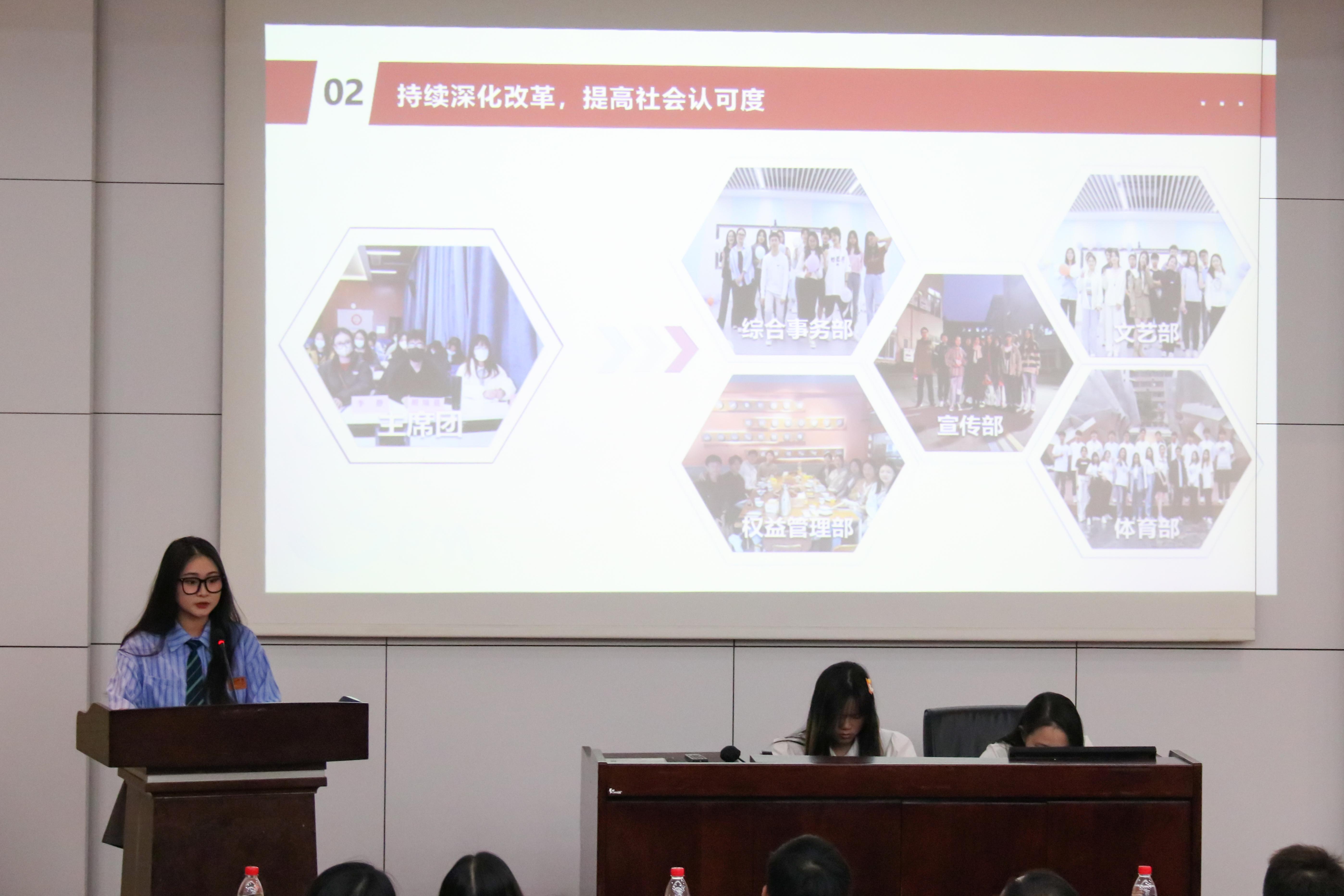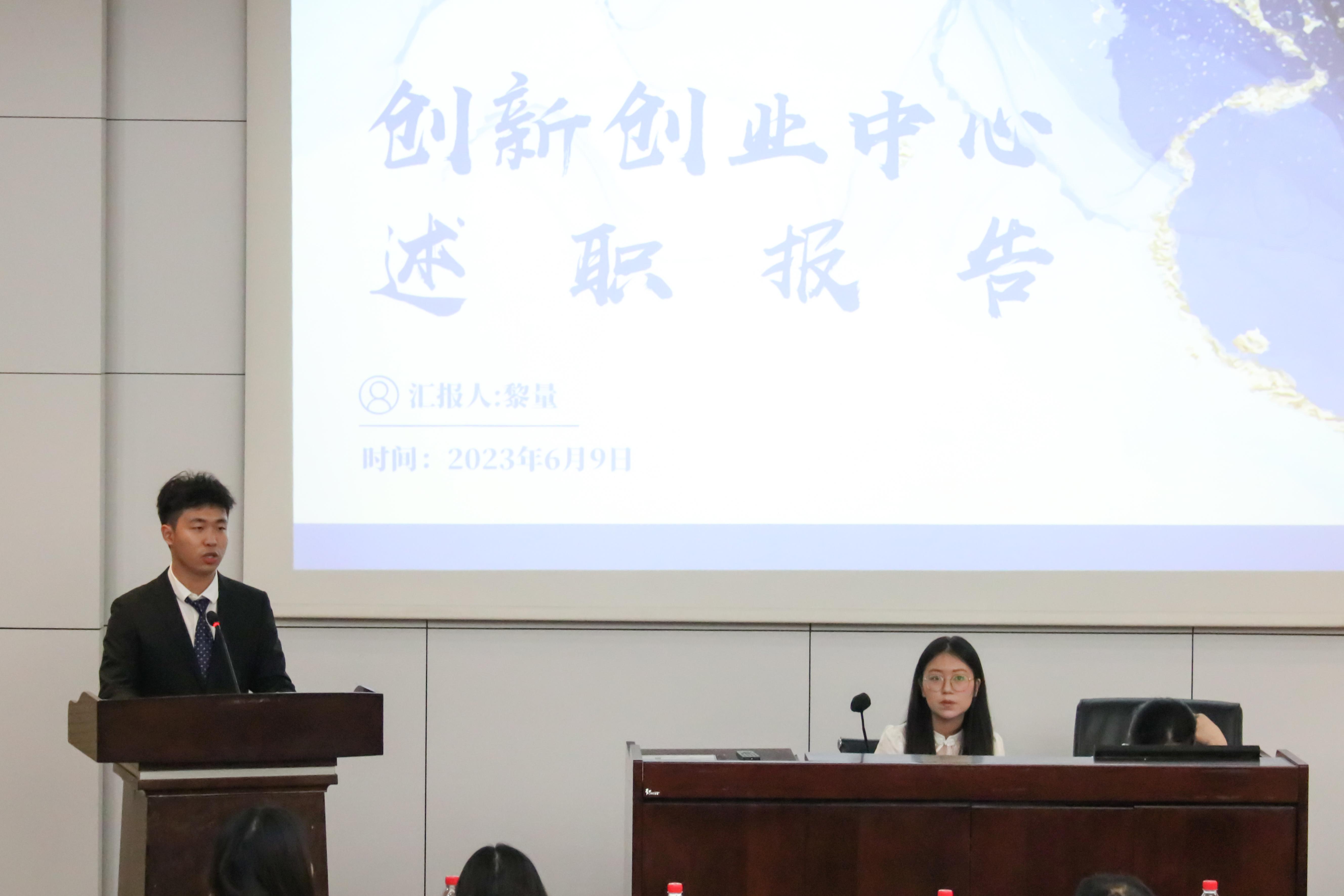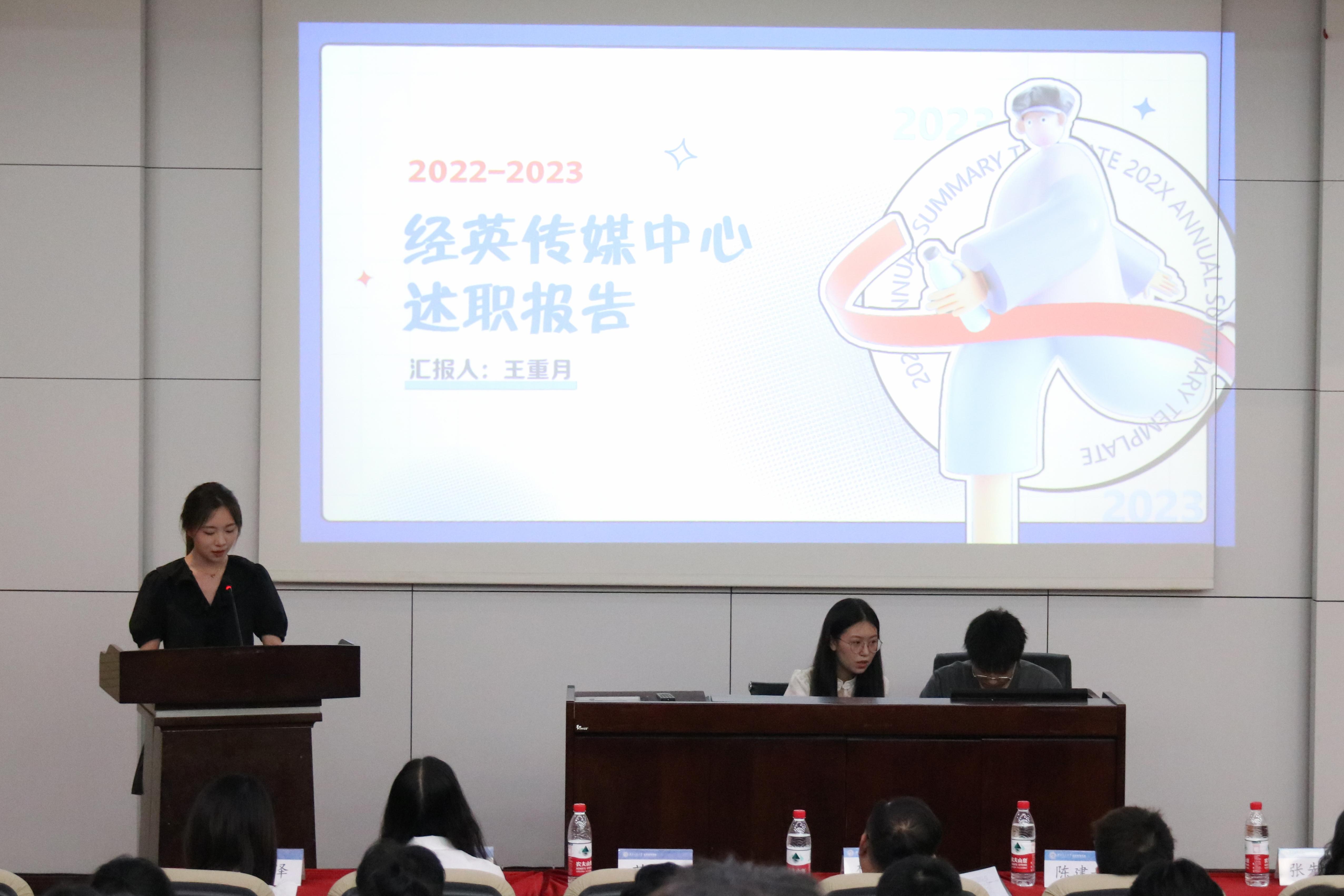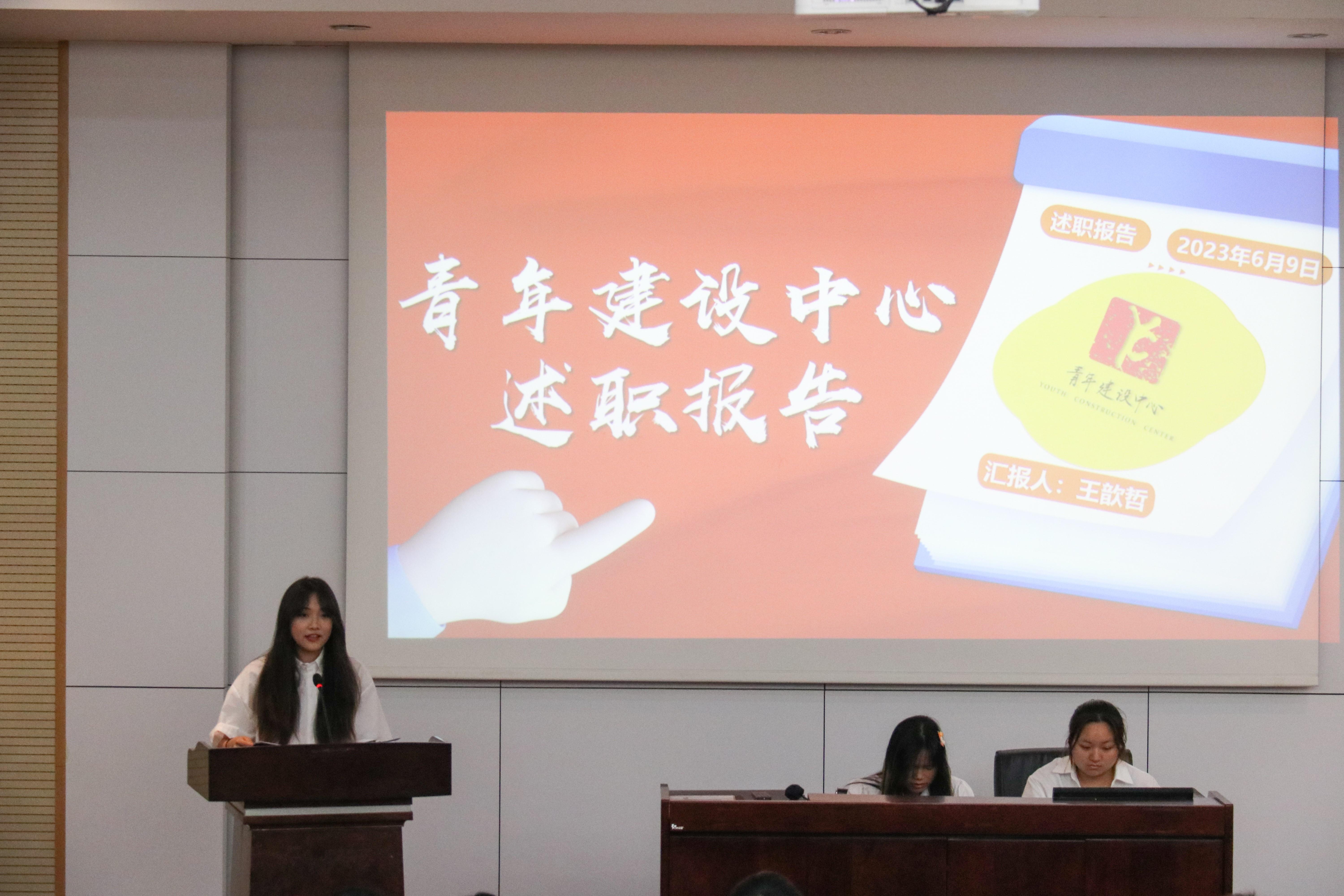 冰球官网的六个团学组织青年建设中心、学生会、青年志愿者协会、创新创业中心、经英传媒中心、班级联合会的负责人依次述职。他们不仅回顾总结了一学年的工作,也对全体团学组织成员的辛勤付出和积极工作表示由衷的感谢。