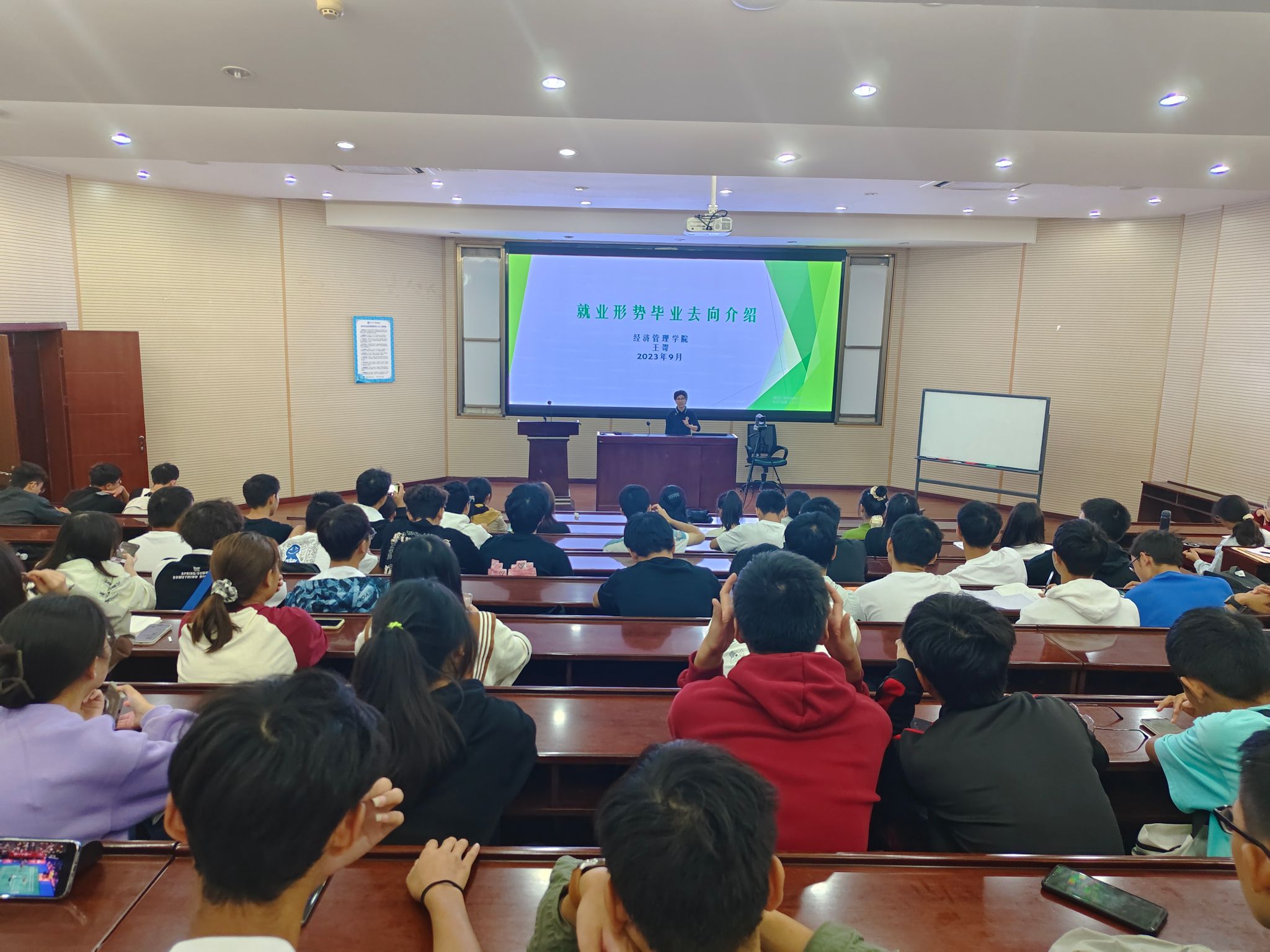 2023年9月27日上午,冰球突破豪华版官方网站本科2023级经济贸易类专业在零号楼0202室召开了生涯教育之就业形势与毕业去向介绍会。学生工作组副组长王哿老师主讲,2023级经济贸易类全体同学参加。此次介绍会旨在帮助同学们了解就业形势,尽快适应大学生,及早明确个人方向,做好个人大学规划,努力提升个人能力与素质。