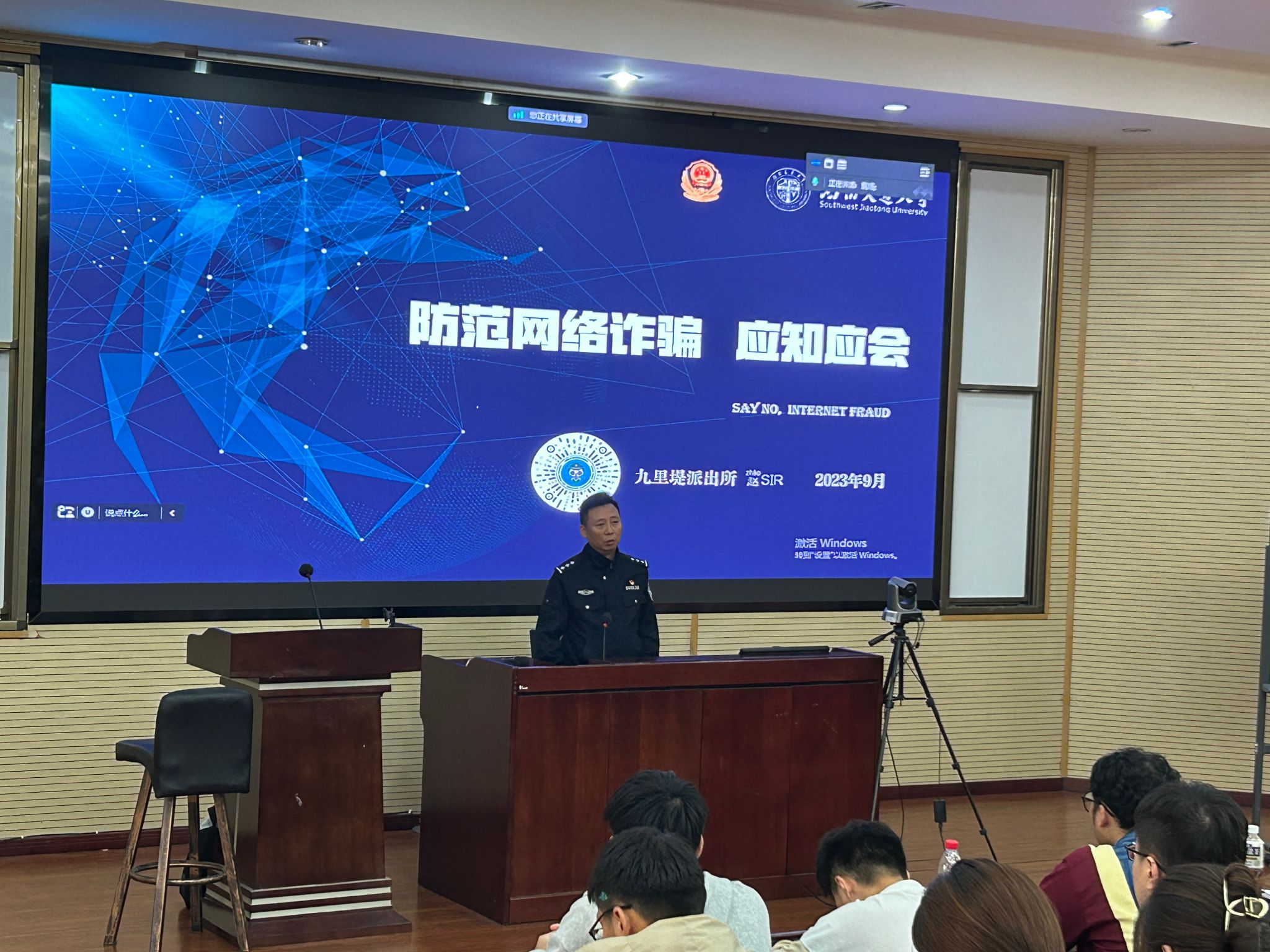 2023年10月12日,下午4点,在0202教室,冰球突破豪华版官方网站邀请九里堤派出所民警为全体研究生新生开展了一场反诈讲座。讲座邀请到了九里堤派出所具有多年防诈经验的民警赵磊主讲,研究生辅导员贺小轩、李勇也出席了讲座。