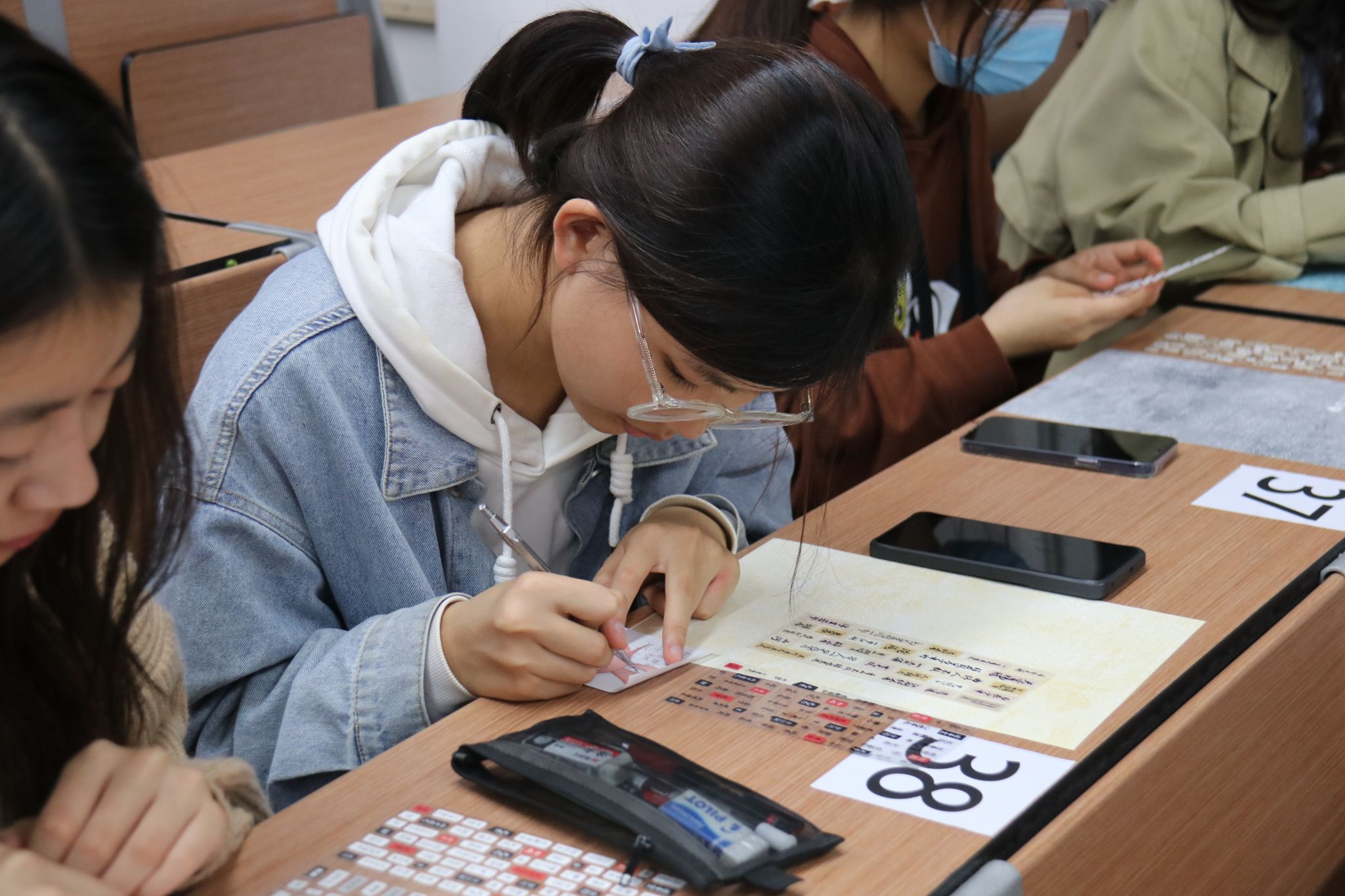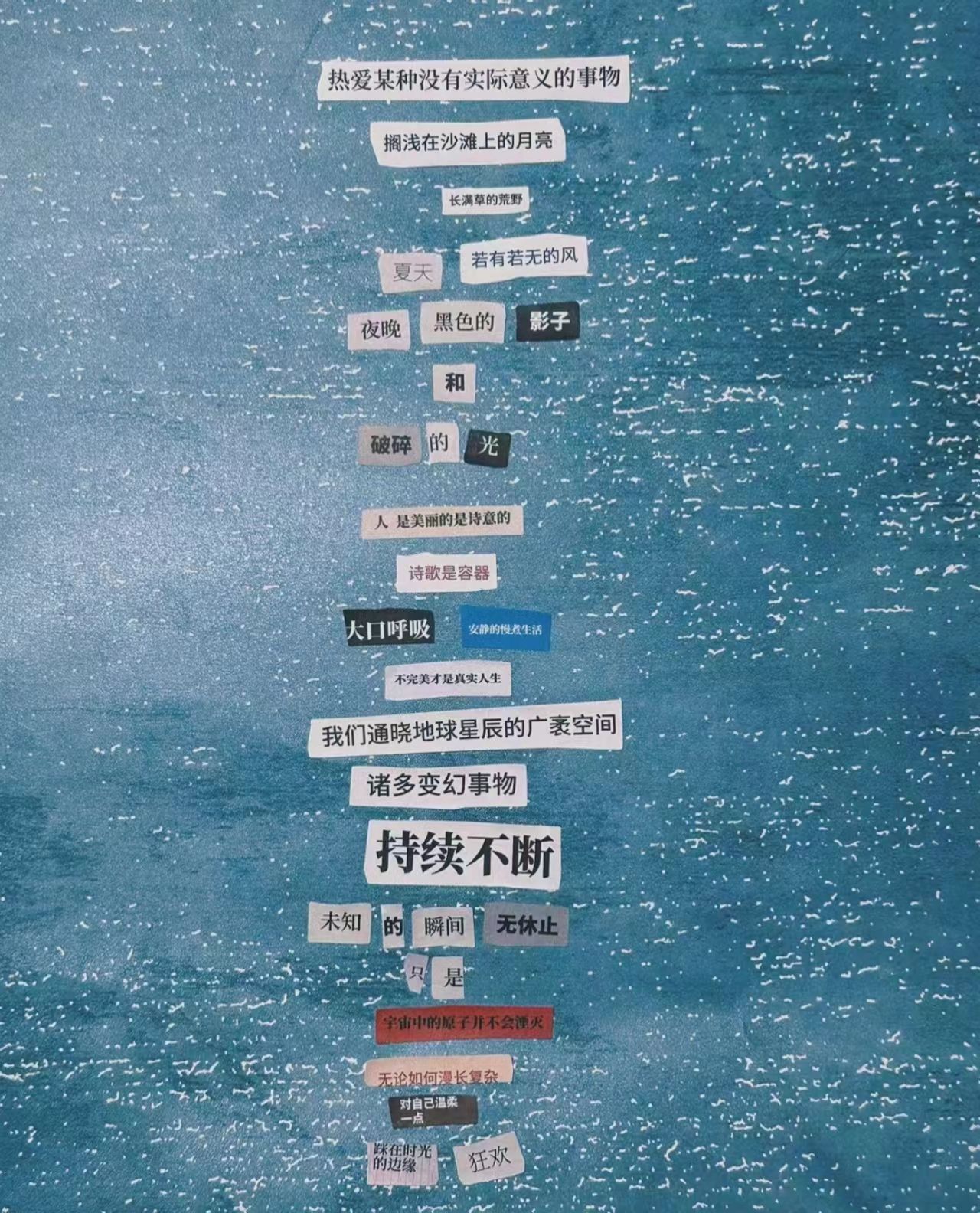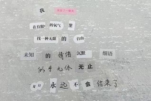 在拼贴诗环节,参与的同学利用主办方提供的文字素材或自带材料,在规定时间内构思、创作拼贴诗。活动现场,同学们互相交换材料,积极讨论,用手中的文字素材进行创作,运用简单的创作工具和随性的组合方式,发挥想象,大胆拼接,以诗抒情,奇思妙想跃然纸上。