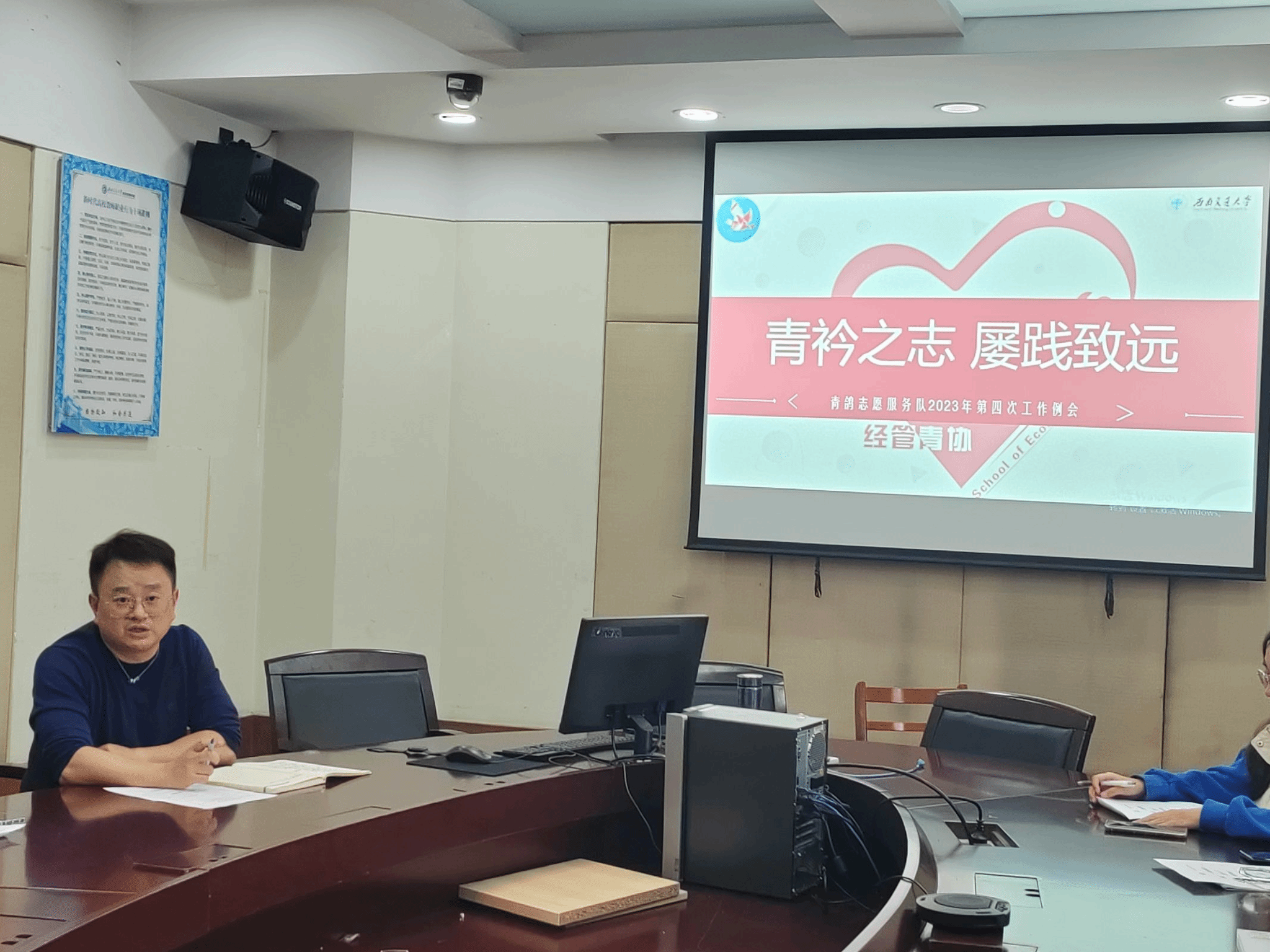 为更好地服务于交大师生,提升志愿服务质量,提升冰球突破豪华版官方网站青年志愿者协会(以下简称“经管青协”)成员的综合素质,成为一名合格的青协人,2023年11月20日中午,经管青协在J0629开展了2023年第四次工作例会暨青鸽志愿服务队业务培训会。
