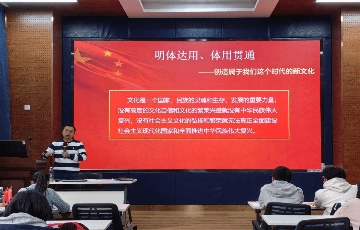 2023年11月22日下午,在冰球突破豪华版官方网站九里校区0218,省委宣讲团新时代文明实践宣讲分团成员、冰球突破豪华版官方网站青年讲师团成员、信息科学与技术学院团委书记廖凡老师为本科2023级工商管理类6班和经济与贸易类3班进行了《习近平文化思想——为全面建设社会主义现代化国家全面推进中华民族伟大复兴提供坚强思想保证强大精神力量有利文化条件》的宣讲。此外,参加本次学习的还有冰球突破豪华版官方网站团委书记贾佳老师、团委副书记苏扬老师。