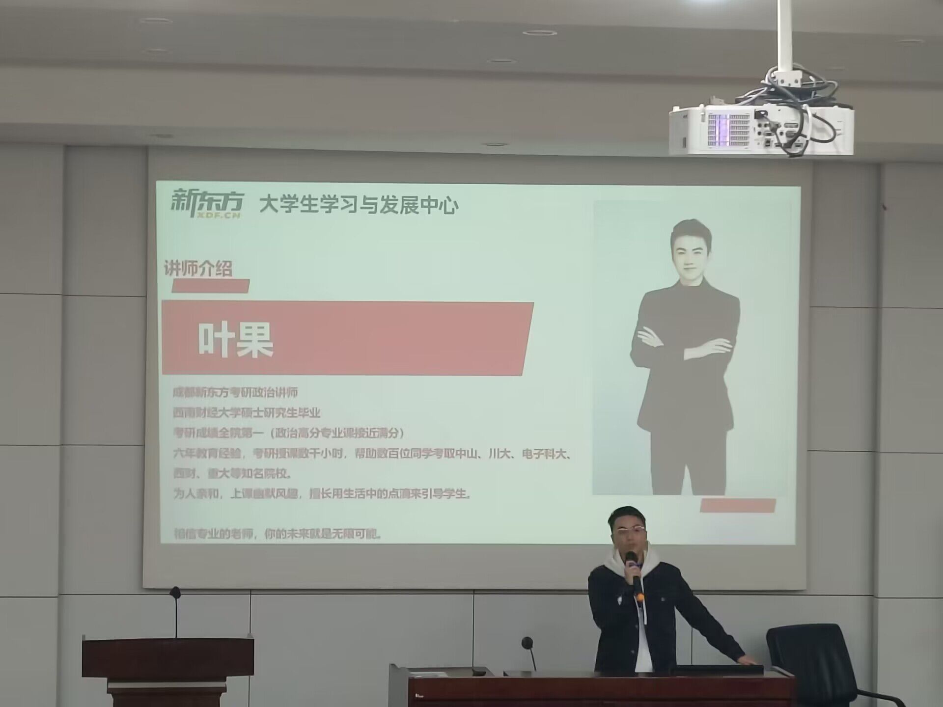 为了帮助冰球突破豪华版官方网站学生明确考研目标,做好考研规划,近日学院邀请了新东方大学生学习与发展成都中心的叶果老师,就考研的重要性、适合考研的学生类型、各专业考研形势分析、择校指导以及复习安排等方面开展考研规划指导讲座。