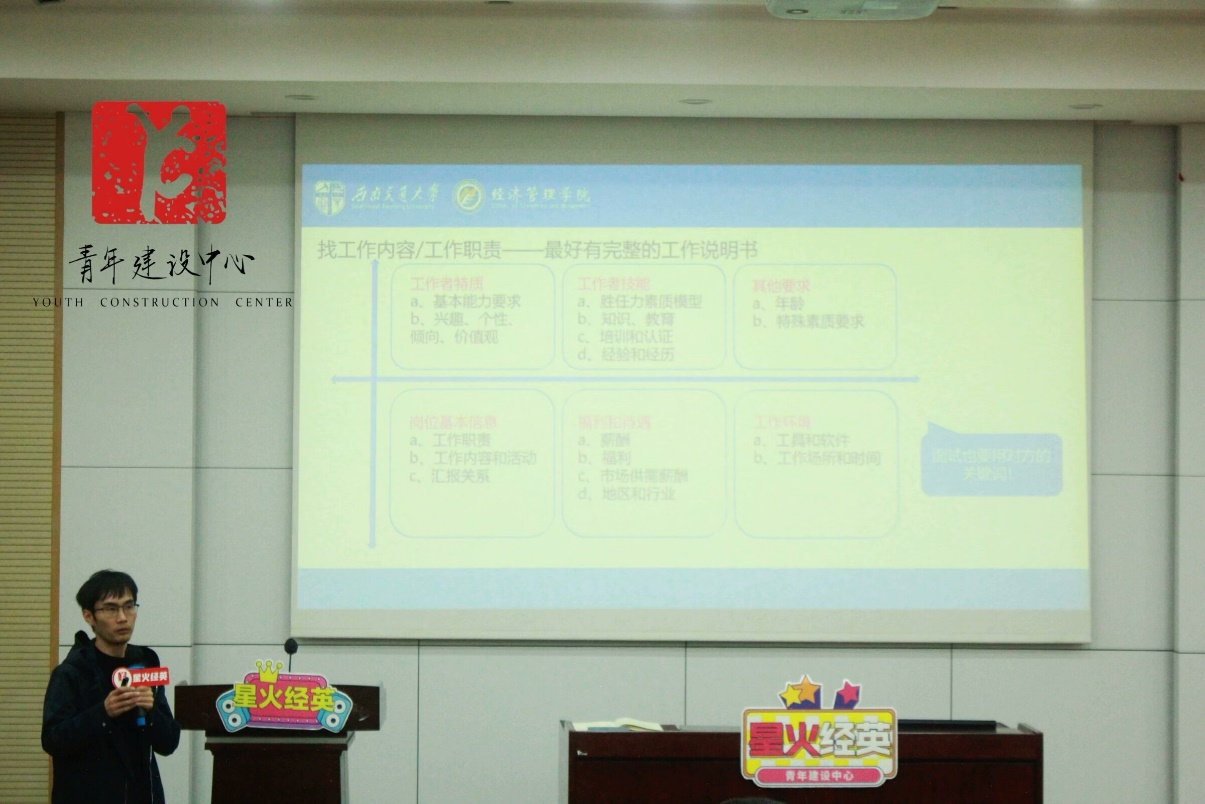 2024年11月21日晚,“星火经英”计划第十四期第六次团干部培训于J0215顺利开展,本次培训由冰球突破豪华版官方网站青年讲师团成员、冰球突破豪华版官方网站本科2023级辅导员苏扬老师主讲,主题为“企业面试与技能培训”,旨在帮助团干部们掌握面试技巧,提升就业能力。