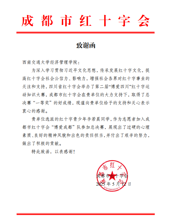 红十字运动以“人道、博爱、奉献”为精神核心,此次大赛不仅是一场知识的竞赛,更是对这一精神的弘扬。李若晨在比赛中展现出的专业素养和团队精神,为学校、学院争得了荣誉,也为广大师生树立了榜样。在他的带动下,会有更多的同学关注红十字事业,将“人道、博爱、奉献”的精神传递得更远。