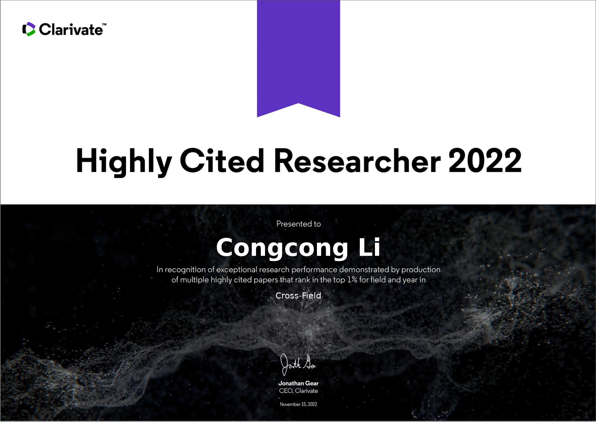 2022年11月15日,科睿唯安(Clarivate Analytics)发布了2022年度“高被引科学家” (Highly-Cited Researchers 2022)名单,来自全球69个国家和地区的6938人入选,其中中国内地的学者1169人。冰球官网信息系统与运营管理系李聪聪老师入选“跨学科领域”(Cross-Field)高被引科学家名单。这是冰球官网历史上第一位上榜的学者,实现了零的突破!