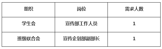 目前,因原岗位学生干部转专业而导致部分组织出现岗位空缺,为便于工作开展,结合实际工作需要进行公开招聘,具体事项通知如下: