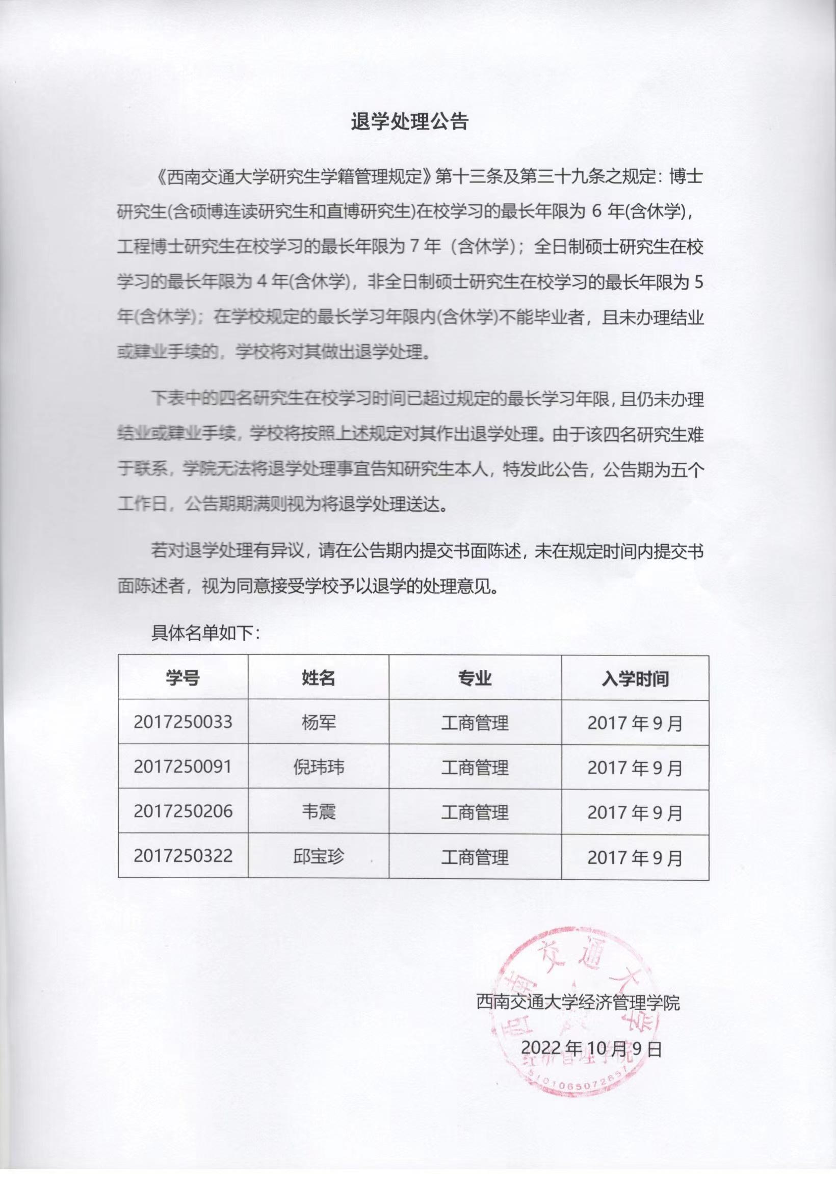 退学处理公告
