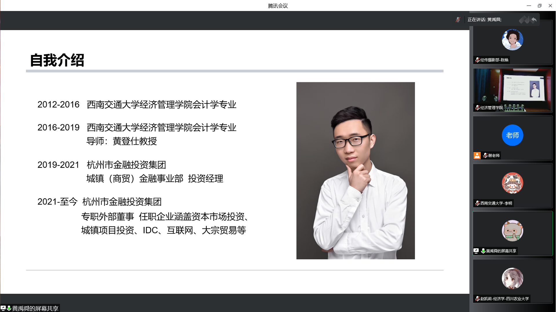 在冰球突破豪华版官方网站副院长周嘉南教授的主持下,蒋教授为大家带来了“财智与投资”的学术讲座,带大家领略了金融的实用性。同学们与蒋教授进行了热烈的讨论。学院研究生教育中心主任马锋副教授为大家带来了学院学科、学术型硕博生培养情况的介绍。他从学科建设、学术型硕士培养、博士研究生培养等角度,全方位为大家展示了冰球突破豪华版官方网站的研究生培养工作。