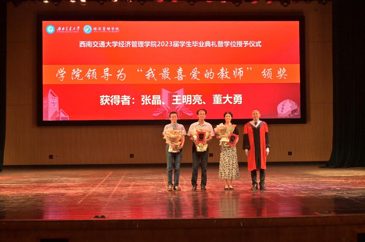 学院副院长李良宣读冰球官网2023届本科毕业生评选的“我最喜爱的教师”名单,获得者是:张晶老师、王明亮老师、董大勇老师,并由王明亮老师作为教师代表为2023届毕业生致临别寄语。他在发言中,回顾了与同学们共同走过的39年风风雨雨,分享了陪伴同学们成长的点点滴滴,希望同学们在将来仍要积极努力,一定要做一个对社会、对集体、对家庭有责任感的人,彰显我们交大经管新青年的大格局、大情怀、大担当。