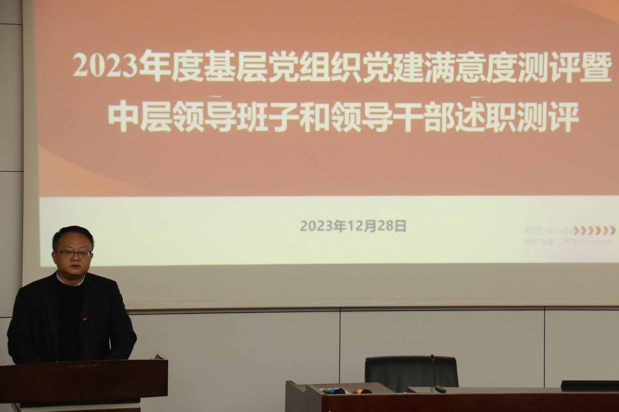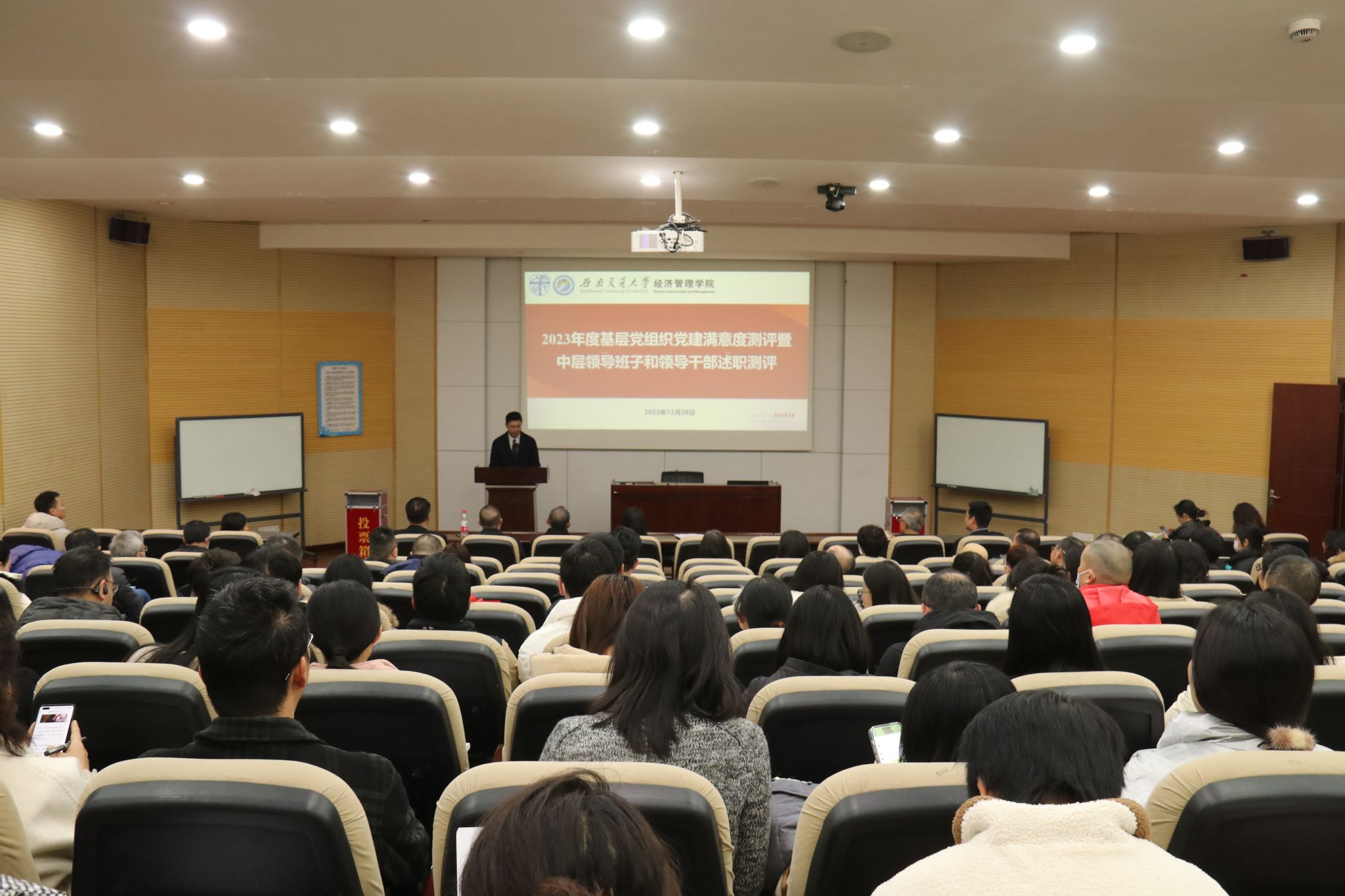 按照学校党委工作部署,2023年12月28日下午16:00,冰球突破豪华版官方网站2023年度党建满意度测评暨中层领导班子和领导干部述职测评大会在九里校区0215教室召开。学院党政领导班子全体成员,学院教职工和学生党员代表参加测评,会议由学院党委书记郭强主持。