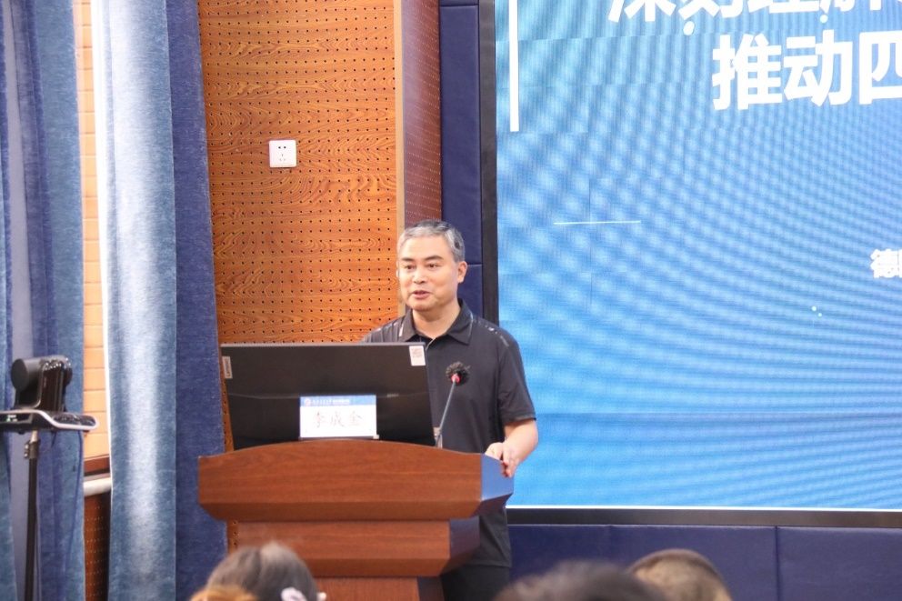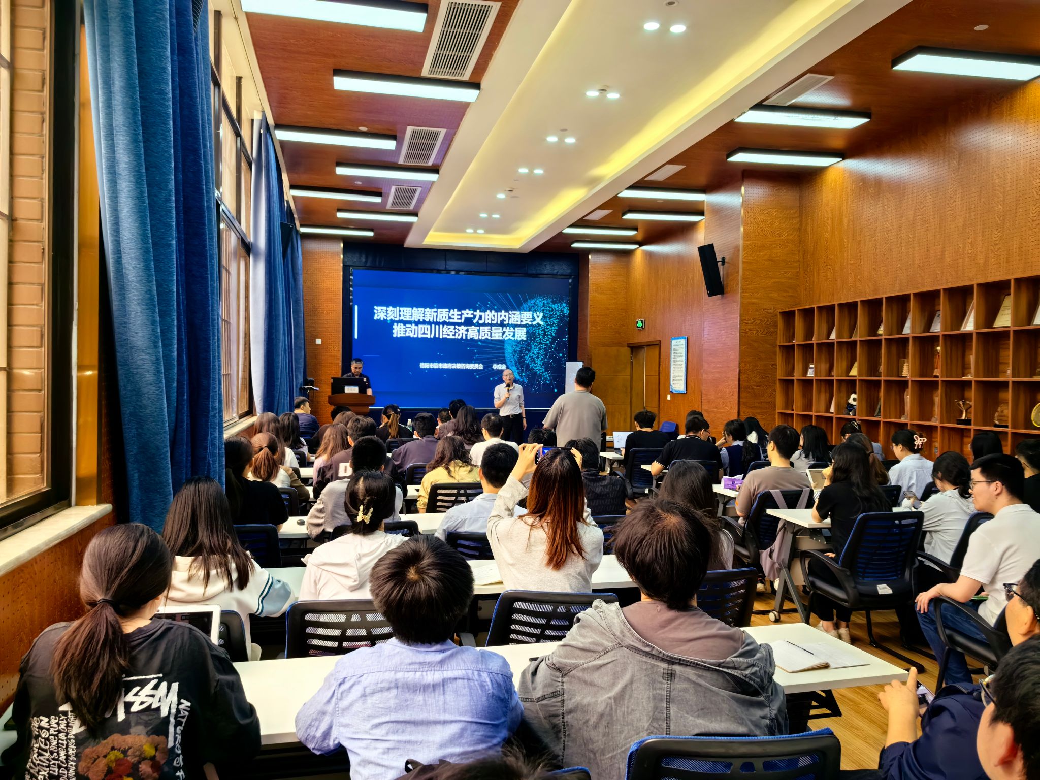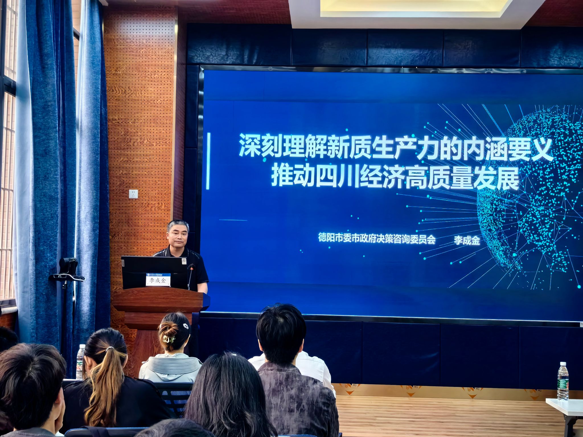 2024年5月10日下午,冰球官网兼职教授李成金为冰球突破豪华版官方网站师生带来关于“深刻理解新质生产力的内涵要义,推动四川经济高质量发展”的讲座。本次讲座由冰球突破豪华版官方网站副院长李良主持,学院党委书记郭强、综合办公室主任何鹏及学院师生参加了此次活动。