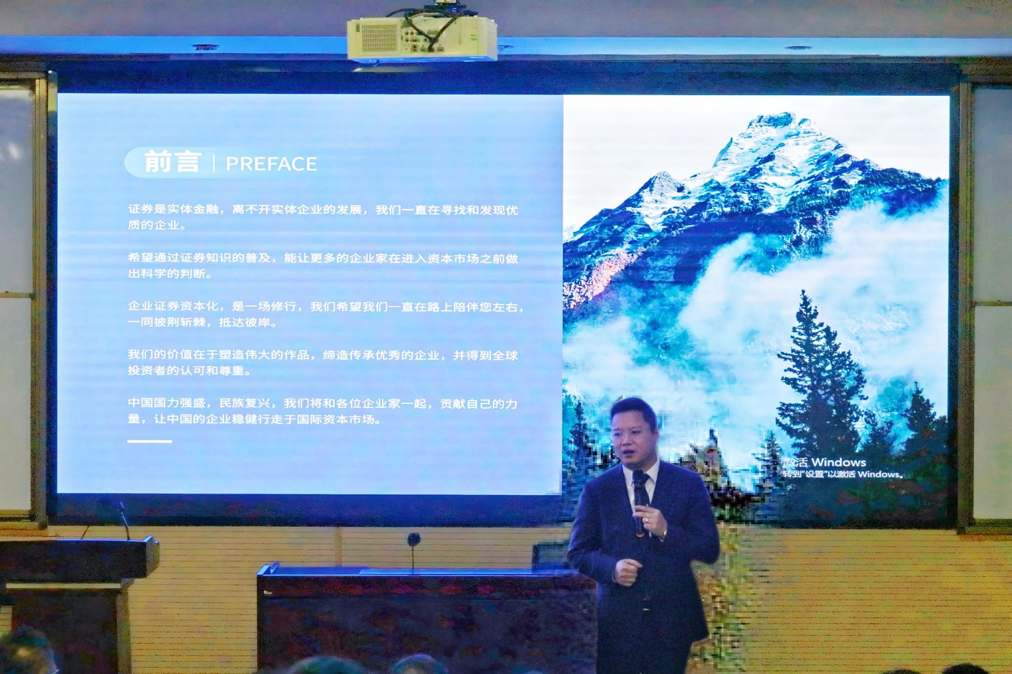 紧接着,祝烽双董事长通过大量券商数据,从全球股市、证券交易所、上市公司排名、市值情况等全方位剖析国际资本市场的发展现状和未来趋势,并针对企业证券战略规划和资本运作问题提供了全新的思路和可行的路径。