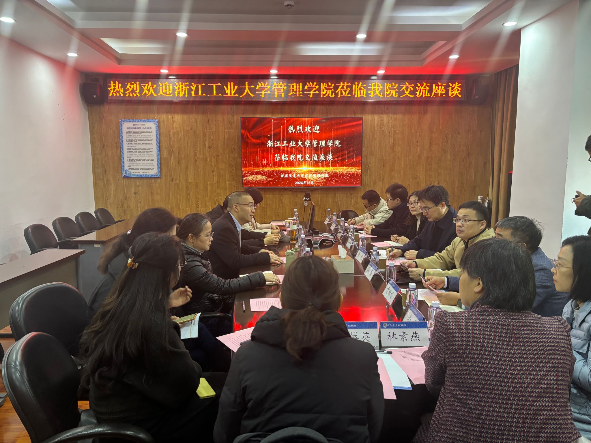 2024年12月26日,浙江工业大学管理学院副院长曹柬等一行10人莅临冰球官网交流座谈。学院副院长聂佳佳、信息系统与运营管理系教授徐进、国际认证中心主任王一帆、经济学系主任郭丽娟、本科教育中心主任赖晓东及相关老师参加了座谈会,学院副院长聂佳佳主持会议。