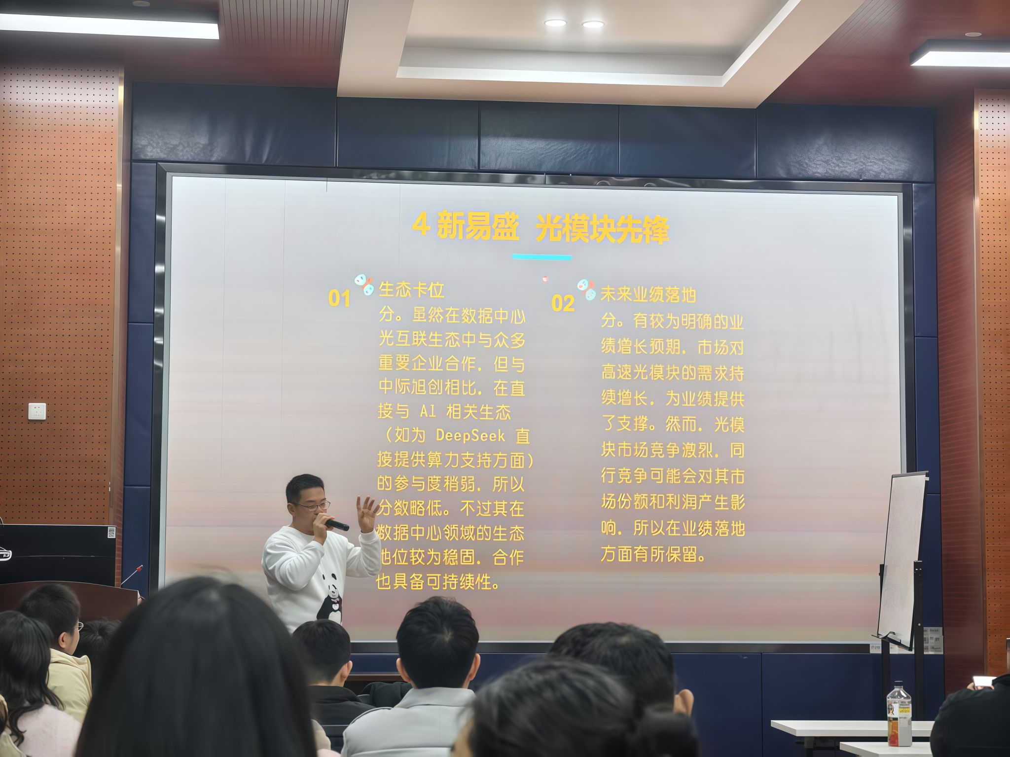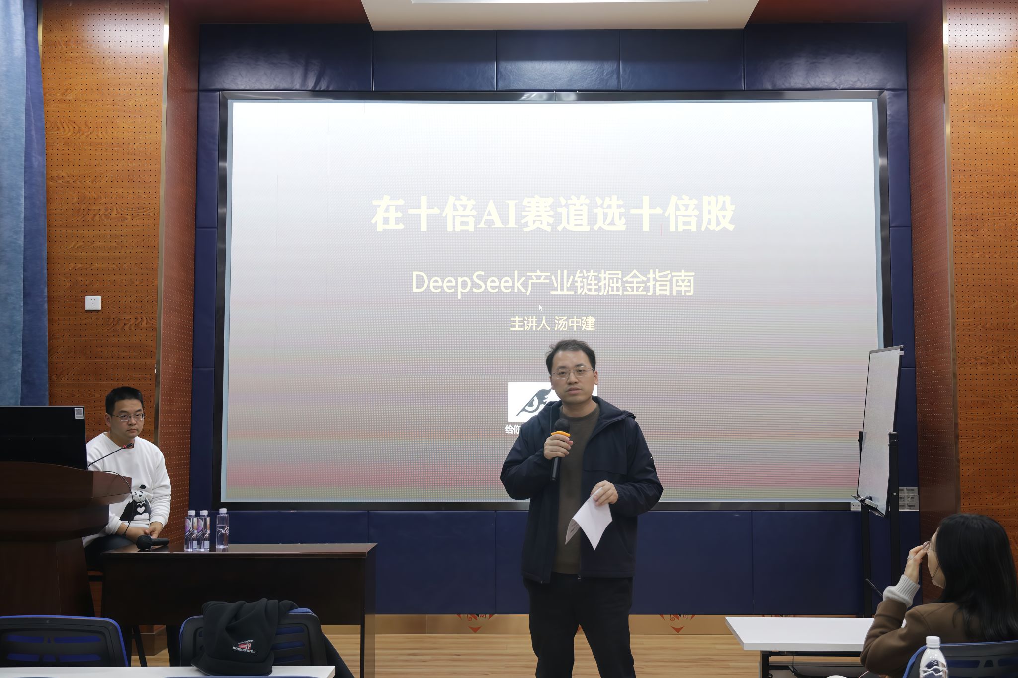 2025年3月15日晚7点,火眼财睛董事长汤中建应邀在冰球突破豪华版官方网站开展了题为“在十倍AI赛道选十倍股”的讲座。本次讲座以DeepSeek为代表的人工智能产业崛起为切入点,旨在通过剖析AI前沿技术应用以及相关产业链,为学生投资实践与未来职业发展提供帮助。本次讲座由学院专业学位教育中心副主任诸波主持。
