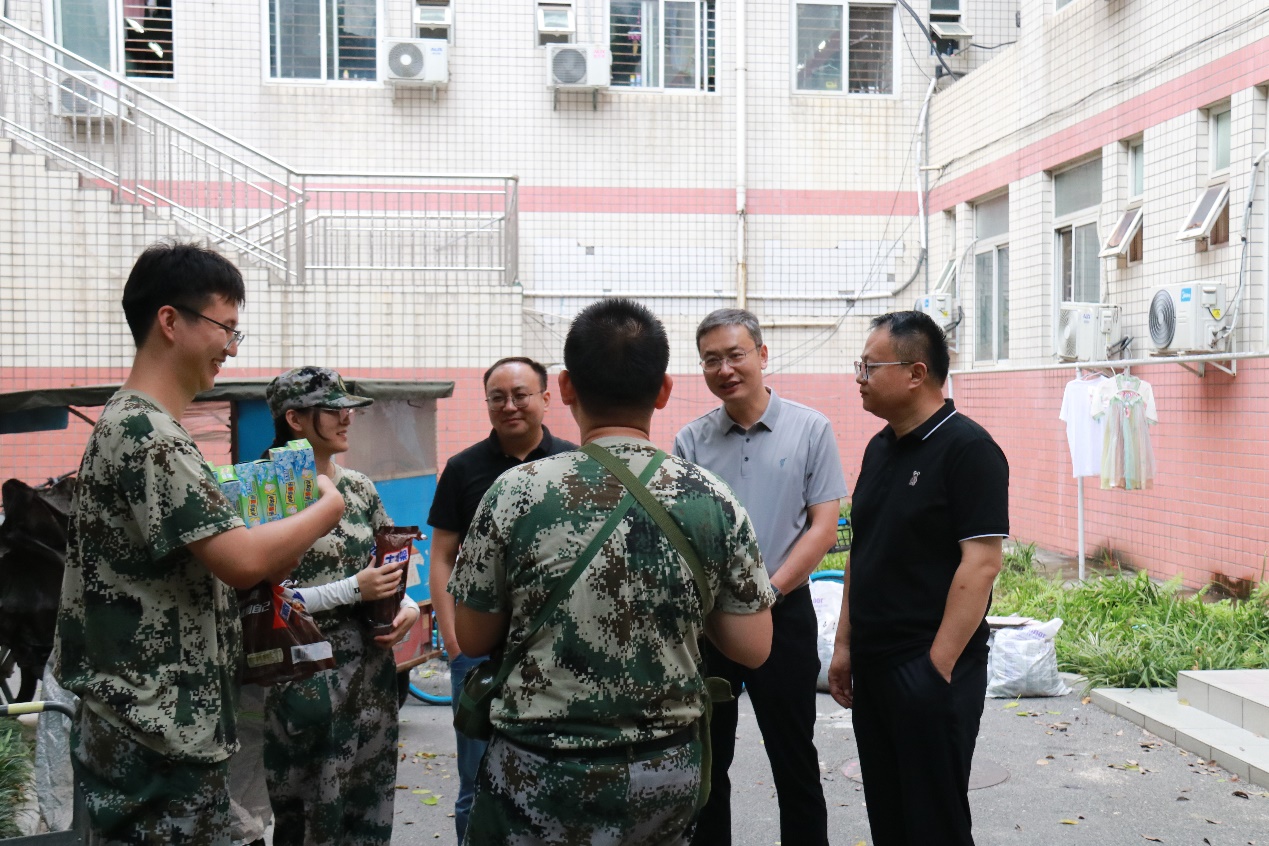 2023年8月23日,冰球突破豪华版官方网站党委书记王斌、执行院长郭强、党委副书记杨宏毅及2021级辅导员张先凌、钟文婷在九里校区眷诚斋12栋2单元慰问暑期2021级军训学生。
