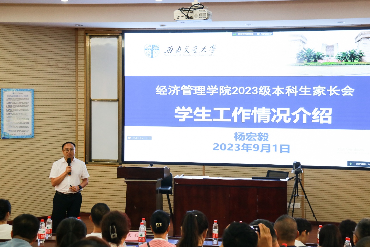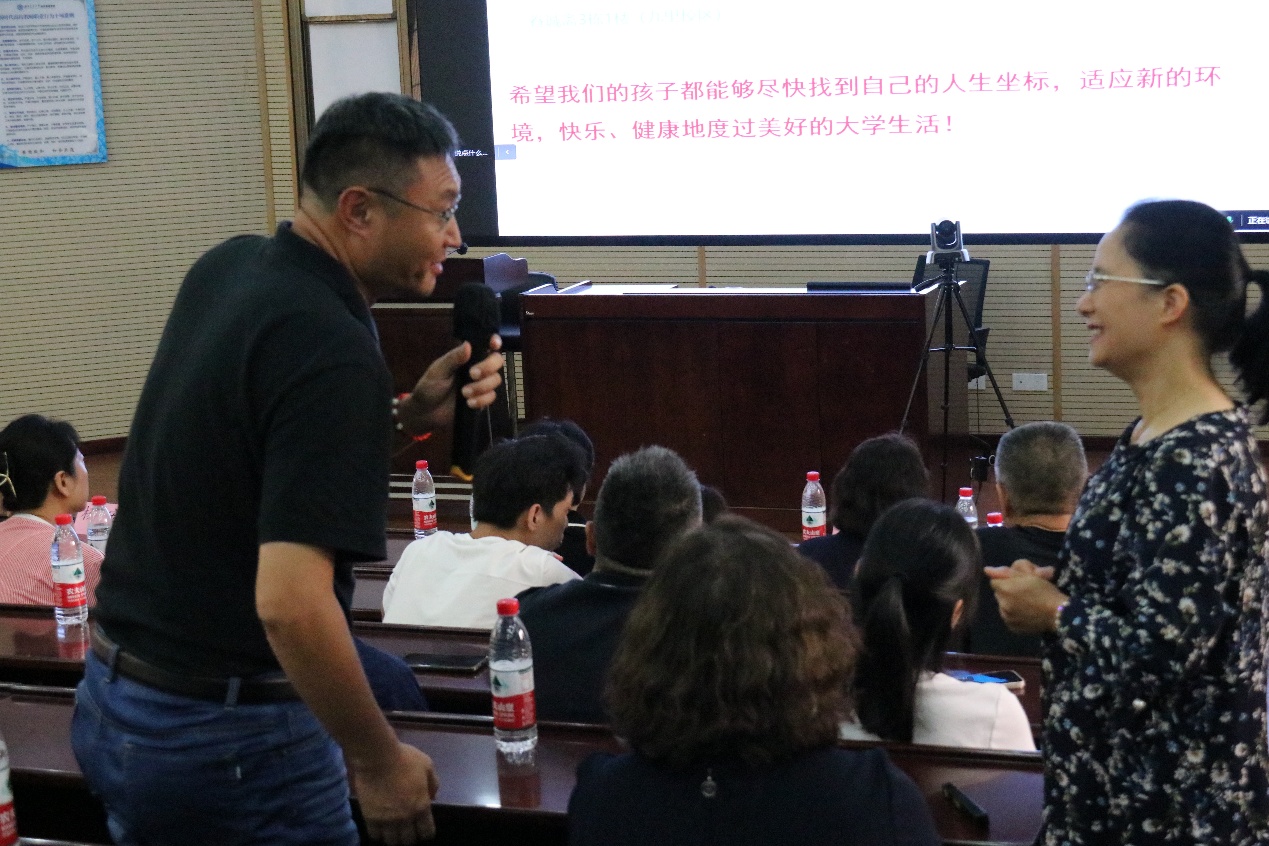 随后,杨宏毅对学生工作情况进行了介绍,从学校历史、学院基本情况、学生工作组的组成和工作职责、家长注意事项等方面展开。其中,他强调家长应注意孩子学习和生活方面的适应状况,并对安全事项做出重要提醒。为了让家长更贴近孩子的大学生活,杨宏毅老师介绍了校、院常用的官方网站和网络媒体,站在老师的角度,为大学生的未来规划提出建议。