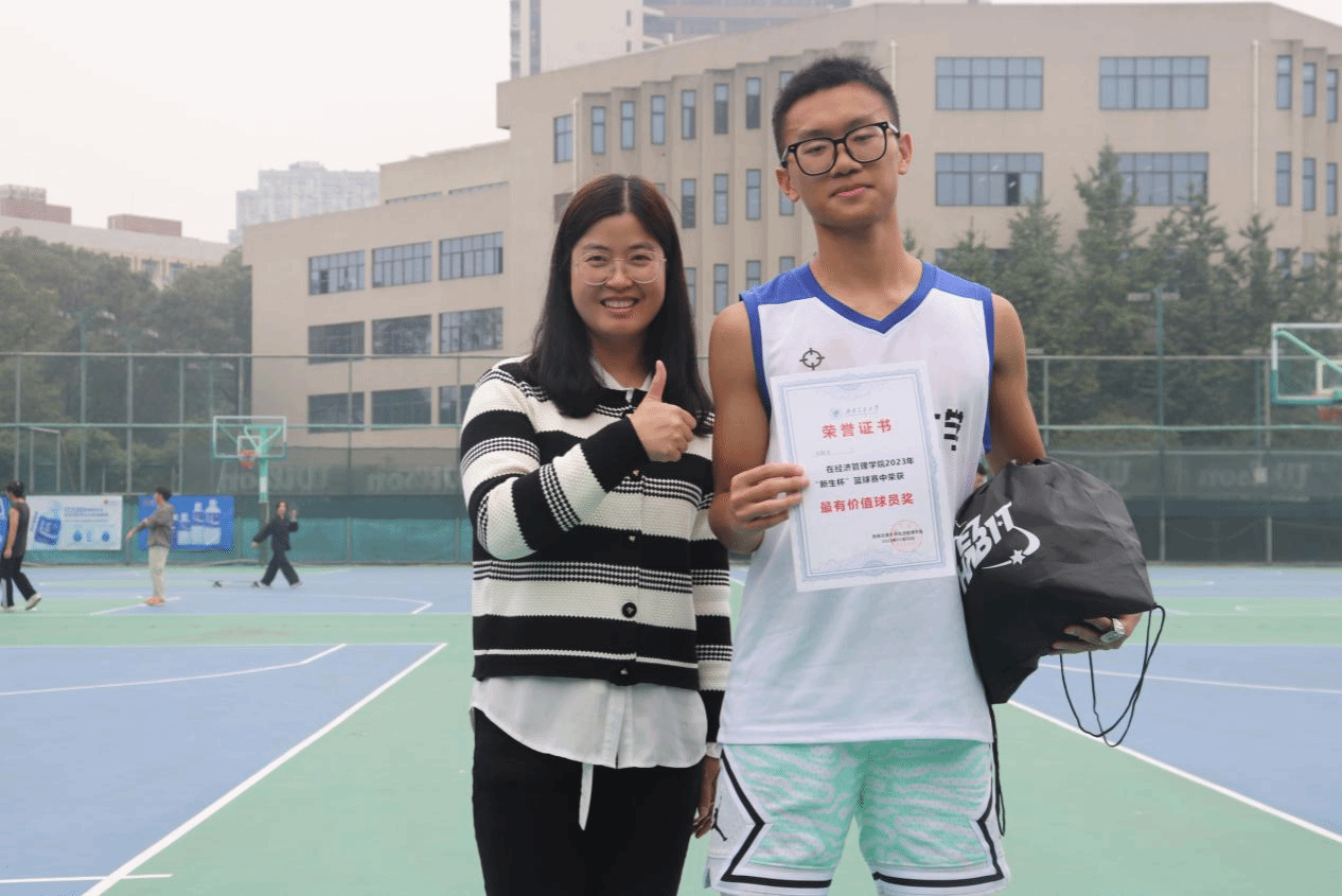 尤钰文同学当选为本次“新生杯”篮球赛FMVP,由余小英老师为其颁发最有价值球员奖证书及奖品篮球。