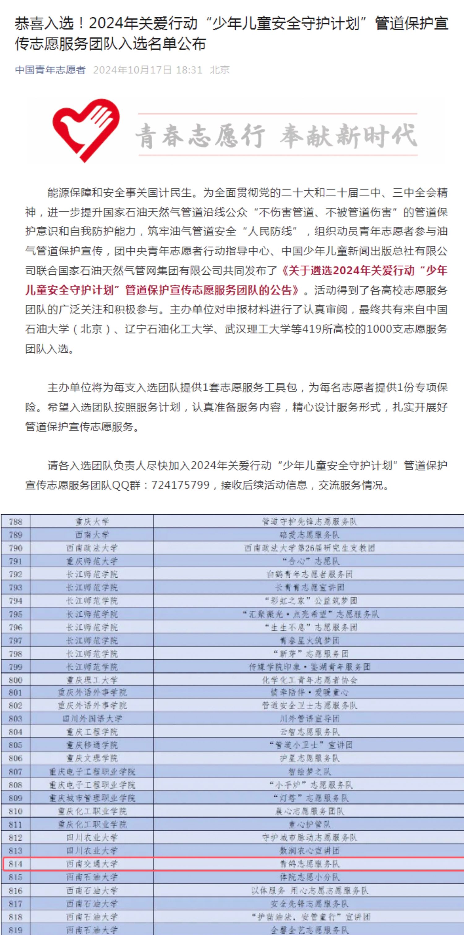 为全面贯彻党的二十大和二十届二中、三中全会精神,组织动员青年志愿者参与油气管道保护宣传,团中央青年志愿者行动指导中心、中国少年儿童新闻出版总社有限公司联合国家石油天然气管网集团有限公司面向全国高校遴选“少年儿童安全守护计划”管道保护宣传志愿服务团队。