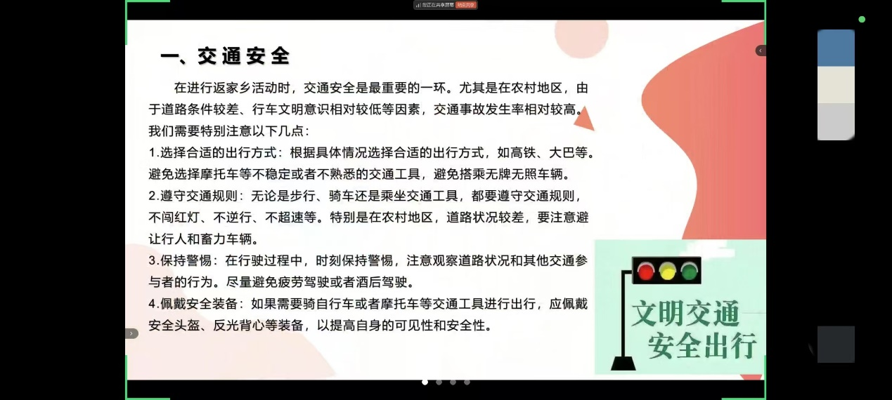 动员环节结束后,青年志愿者协会的干事细致地为各支队伍讲解“返家乡”相关事宜,围绕活动介绍、安全须知、实践要求、报账流程、投稿环节、经验分享、风采展示这几个方面展开。主讲人强调各队伍成员要严格遵循制度纪律,按时进行安全报备,保证出行安全。同时,提醒各支队伍在寒假实践期间随时关注气象变化,预防冬季常见疾病;具备完善的安全常识,做好充足的出行准备,增强救护能力。并列举了常见的极端天气与灾害自救方法以及预防冬季疾病的注意事项。特别提醒大家,各项实践活动应在保障队员安全的情况下进行,如遇突发情况应及时取消行程并向学校、学院报备。