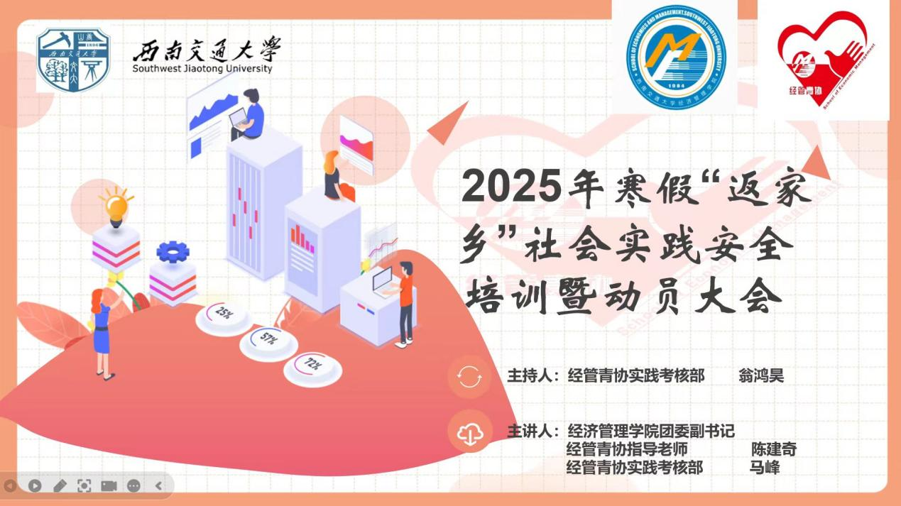 为提高大学生参与社会实践活动的安全意识、避险常识和应急自救能力,同时激发大学生参与实践活动的热情,2025年1月9日下午5点,冰球突破豪华版官方网站寒假“返家乡”社会实践安全培训暨动员大会在线上举行,学院团委副书记陈建奇、青年志愿者协会干部以及18支校、院级及专项队伍一起参加了大会。