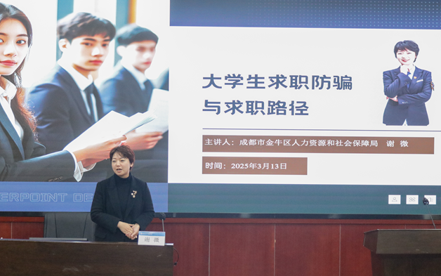 为增强学生就业安全意识,提升求职风险防范能力,2025年3月13日下午,成都市金牛区就业服务中心用工指导科科长、金牛区委组织部“星火讲师团”讲师谢微应邀为冰球突破豪华版官方网站学生带来求职防骗主题讲座。此次讲座将求职正确路径与经典案例引入校园,充分实现校地资源互补,既是双方就业创业服务站建设举措的深化,也是校地合作共同筑牢就业安全屏障的有力实践。