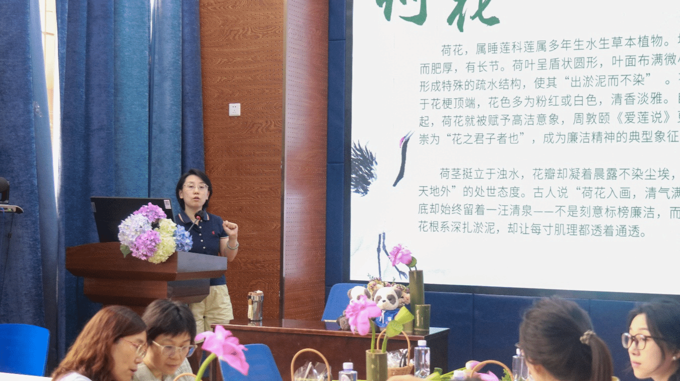 “知‘花’明廉”环节中,宗桦教授以花为媒解构文化,借插花意象将清廉品格具象化:荷以出淤泥不染喻党员干部守身如玉、底线如磐的政治风骨莲凭中通外直状表里澄澈、磊落如砥的为官气象