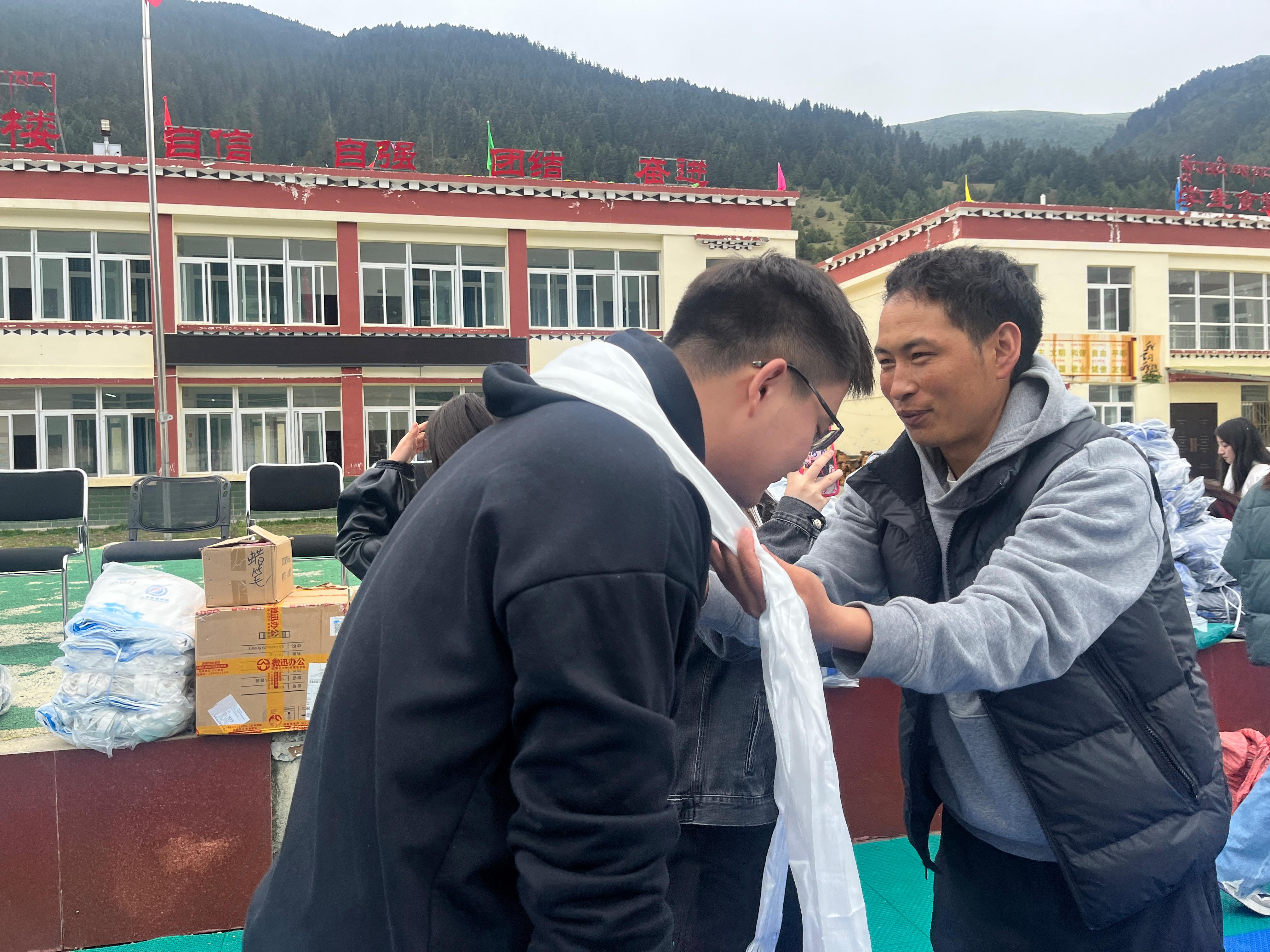 在活动现场,中心校校长多得为志愿者们献上洁白的哈达,表达他们的对志愿者的欢迎、感谢与祝福。参加活动的志愿者为道孚县银恩乡中心校的孩子们发放了全新定制的校服、书包、文具套装、文体用品等物资。当收到捐赠的新衣、新书包后,孩子们的脸蛋上也露出了幸福的笑容。