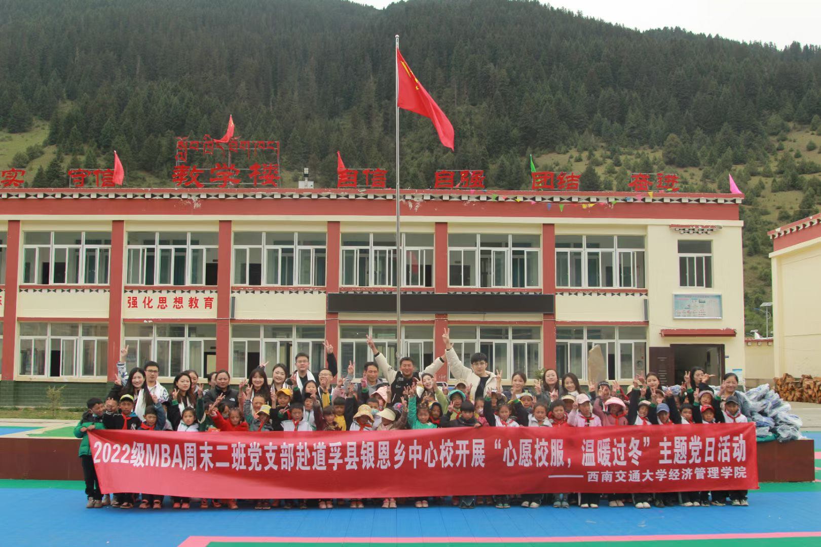 千里之行送爱心,百件新衣传真情。交大学子高原聚,共谱民族教育兴。6月10日,由冰球突破豪华版官方网站2022级MBA周末二班临时党支部发起的“心愿校服·温暖过冬”主题党日活动在甘孜州道孚县银恩乡中心校如期举行。该活动不仅为银恩乡中心校100余名孩子送上了新校服、新书包和学习用品,更送去了西南交大莘莘学子的暖暖爱心。