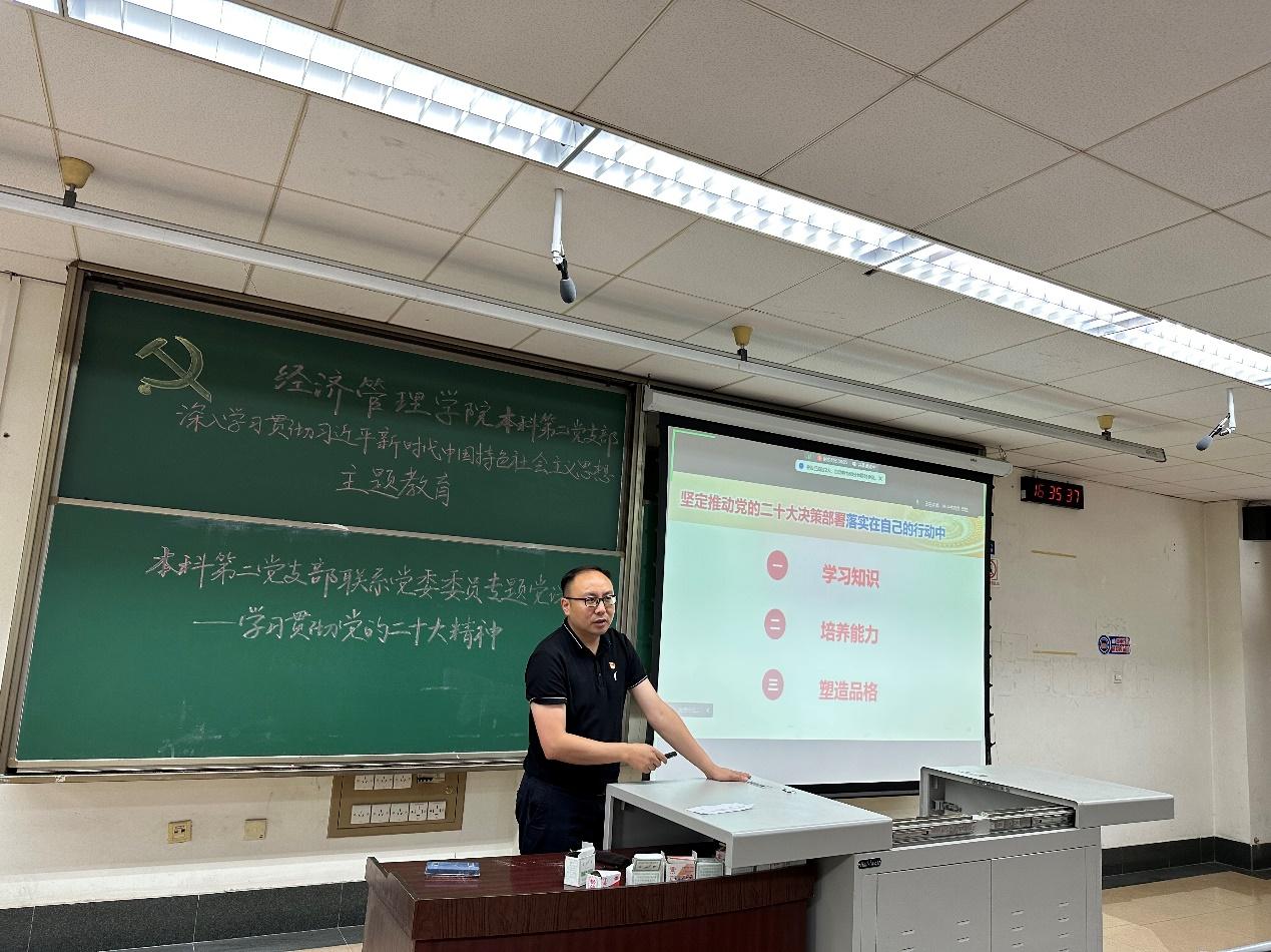 为扎实推进学习贯彻习近平新时代中国特色社会主义思想主题教育,6月8日,冰球突破豪华版官方网站本科第二党支部邀请党支部联系党委委员杨宏毅副书记为党支部成员讲授专题党课,加强理论学习,接受思想洗礼。