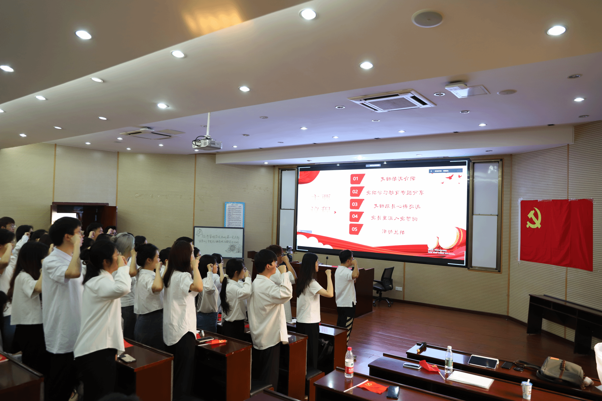 最后,由党支部书记陈建奇领誓,全体党员举起右拳面对党旗重温入党誓词,入党誓词中那一句“严守党的纪律”是党员在入党时对党和人民作出的庄严承诺,需要每一个中国共产党人用一生来践行。