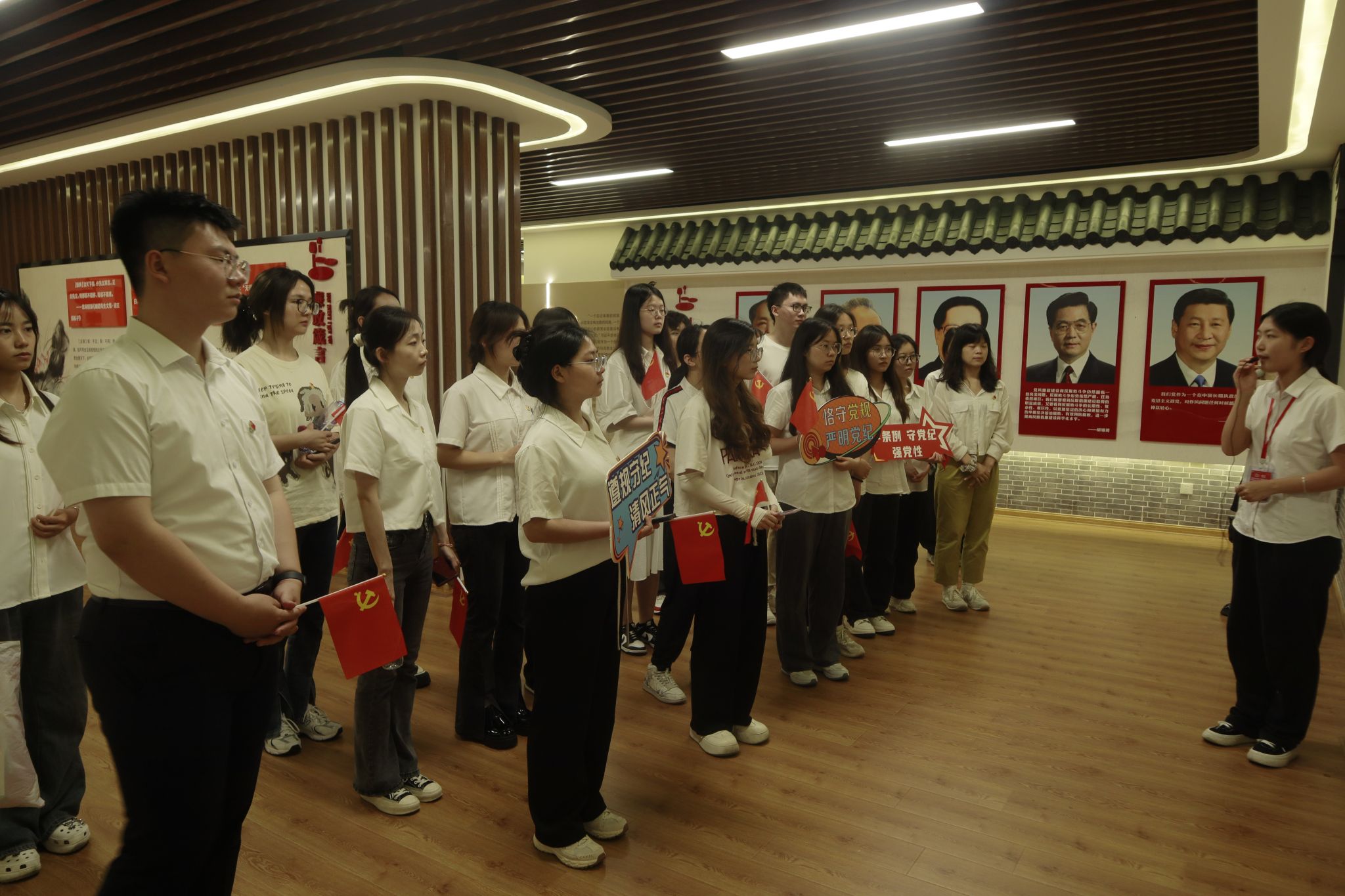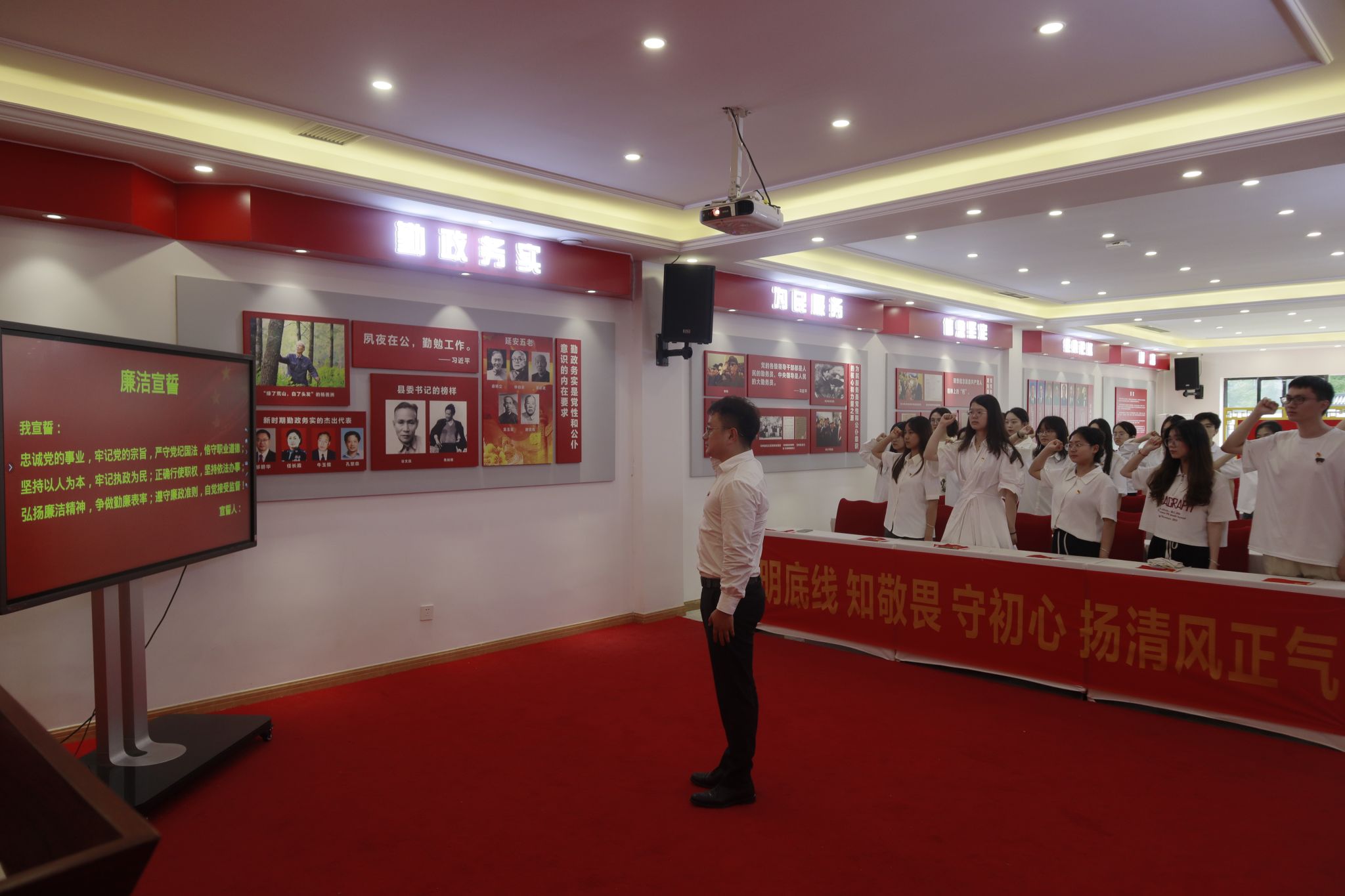 参观完荷花基地,党支部来到党性与公仆意识教育主题教室,开展学习研讨。在党支部书记陈建奇的带领下,全体党员首先进行廉洁宣誓,大家紧握右拳,精神饱满,深情专注,铮铮誓言表达了拳拳初心。接下来,跟随讲解员的解说,大家学习了微党课《党的好儿女—张露萍》《周恩来总理的故事》等内容,走进和了解先进事迹,党支部成员都深受榜样力量的鼓舞,进一步坚定了自己的理想信念,增强了党性认识;随后,大家逐一上前交流发言,相互分享今日所见所得。党员同志们讲到,党员应知廉敬廉、警廉醒廉、听廉学廉,尤其是即将走向社会的毕业生党员,更应将党纪时刻放在心中,遵守党的纪律,加强自我约束,保持自我警醒。最后,大家纷纷表示要树立廉洁自律好作风、好习惯,恪守党员道德,清廉自守,干净做事。