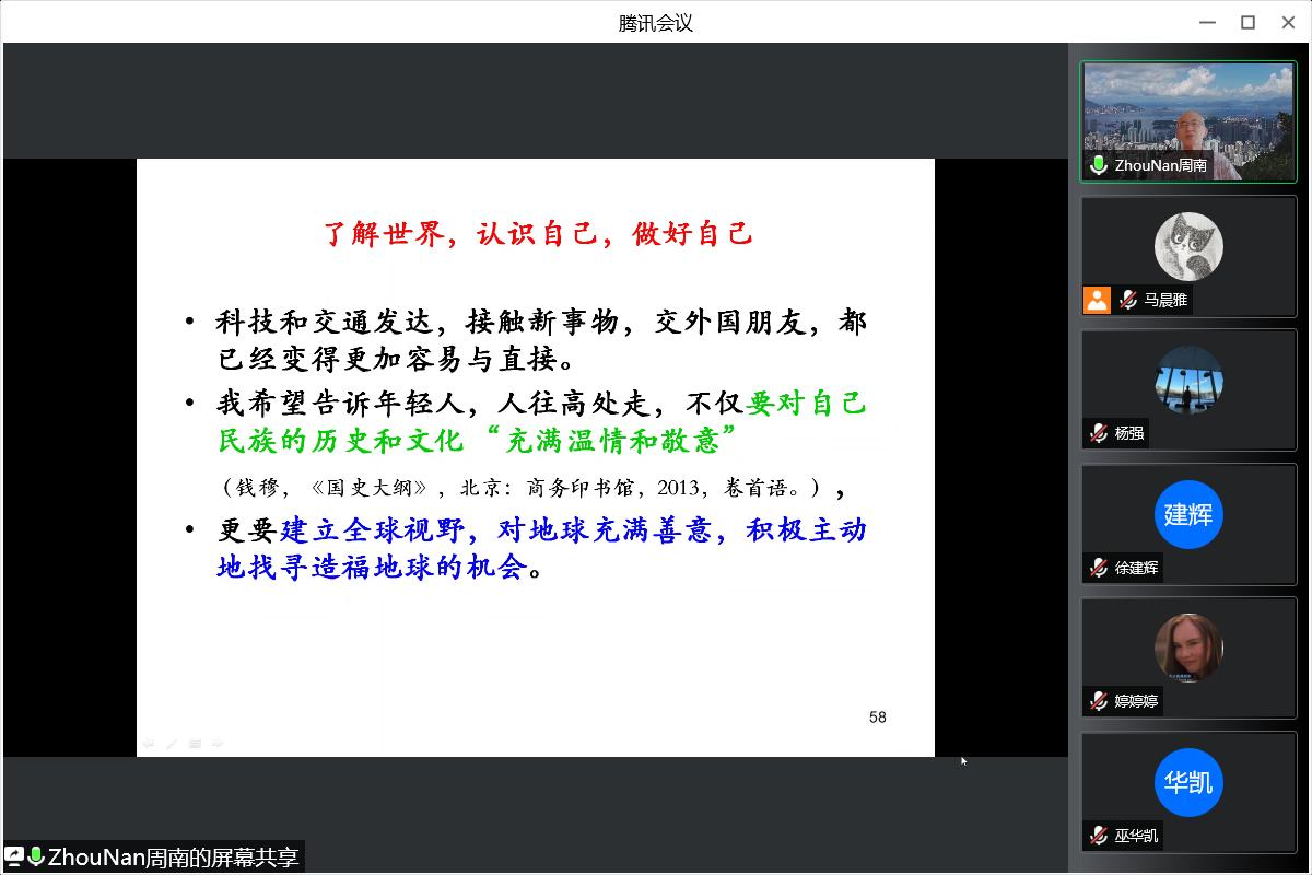 讲座尾声,周南教授引用钱穆先生《国史大纲》的卷首语“对自己的历史文化,须具温情与敬意”,对师生提出“建立全球视野,对地球充满善意,积极主动地找寻造福地球的机会”的期望,并详细解答了线上师生的问题。蒋玉石教授对周南教授的精彩分享致以诚挚的感谢,希望冰球官网师生能够借此良机开阔学术思路、提高创新能力。