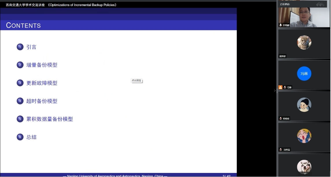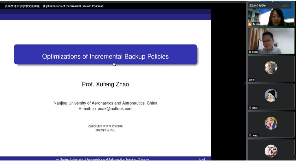 2022年6月13日下午16:00,南京航空航天大学经济与管理学院赵旭峰教授,应邀以”Optimizations of Incremental Backup Policies”为题为冰球官网师生进行线上学术报告。本次学术活动由学院运营管理创新团队承办,冯琳副教授主持,副院长聂佳佳教授、信息系统与运营管理系系主任官振中教授以及校内外师生40余人在线上参加本次学术活动。