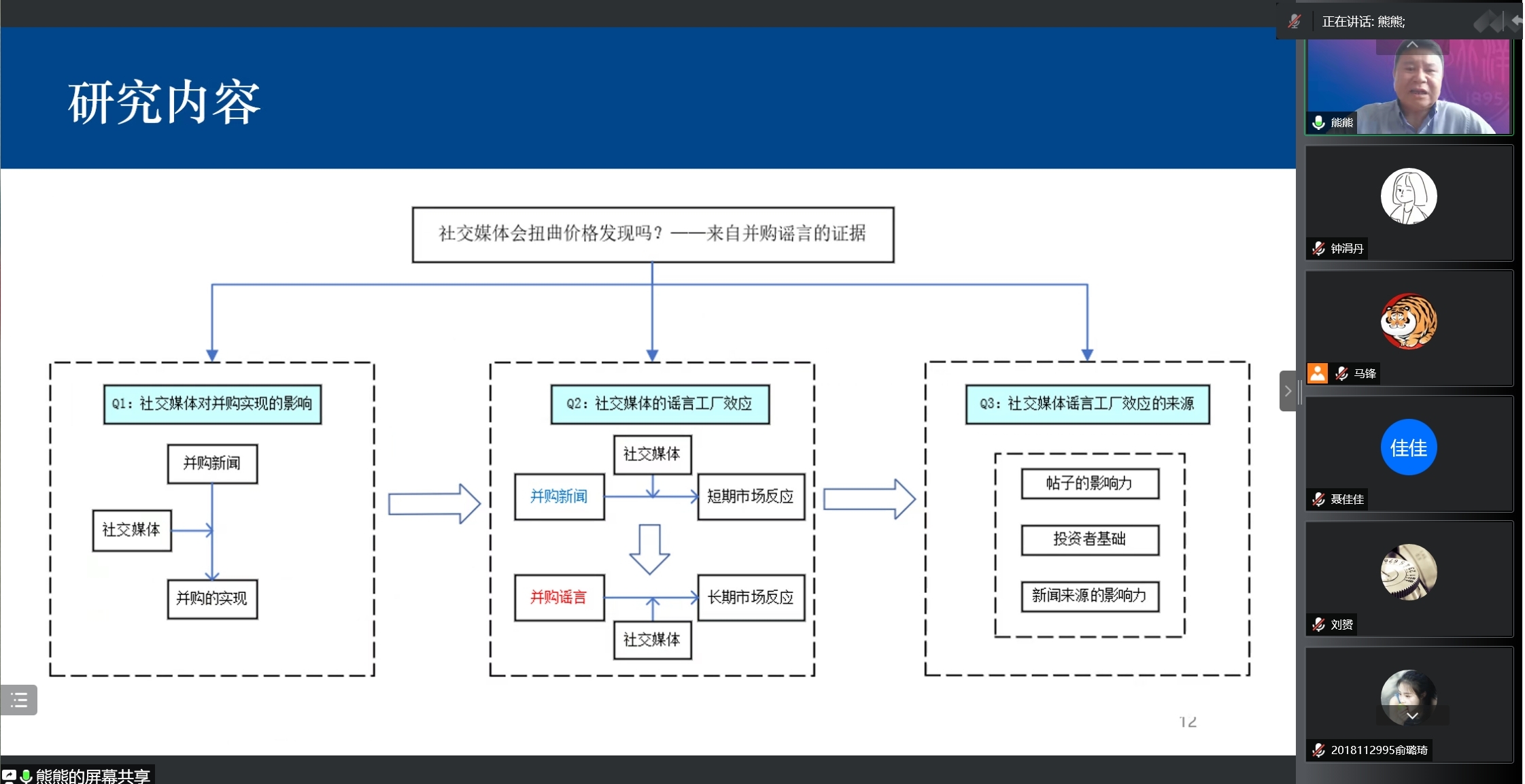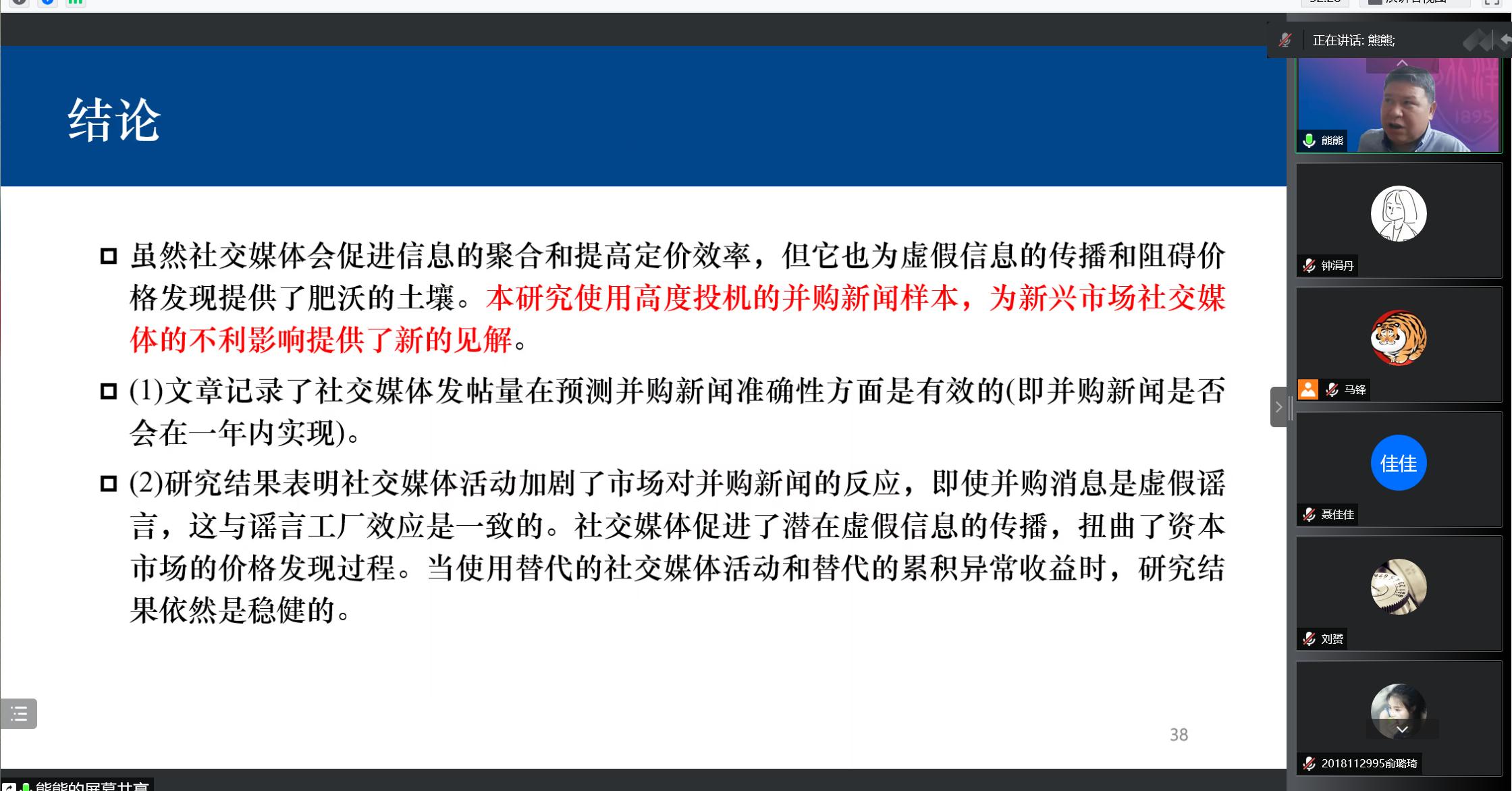 分享结束后,熊熊教授和师生们就并购新闻和市场反应等问题进行了积极地交流和讨论,为大家后续的研究和学习拓宽了思路。最后马锋副教授对熊熊教授的精彩分享致以诚挚的感谢。
