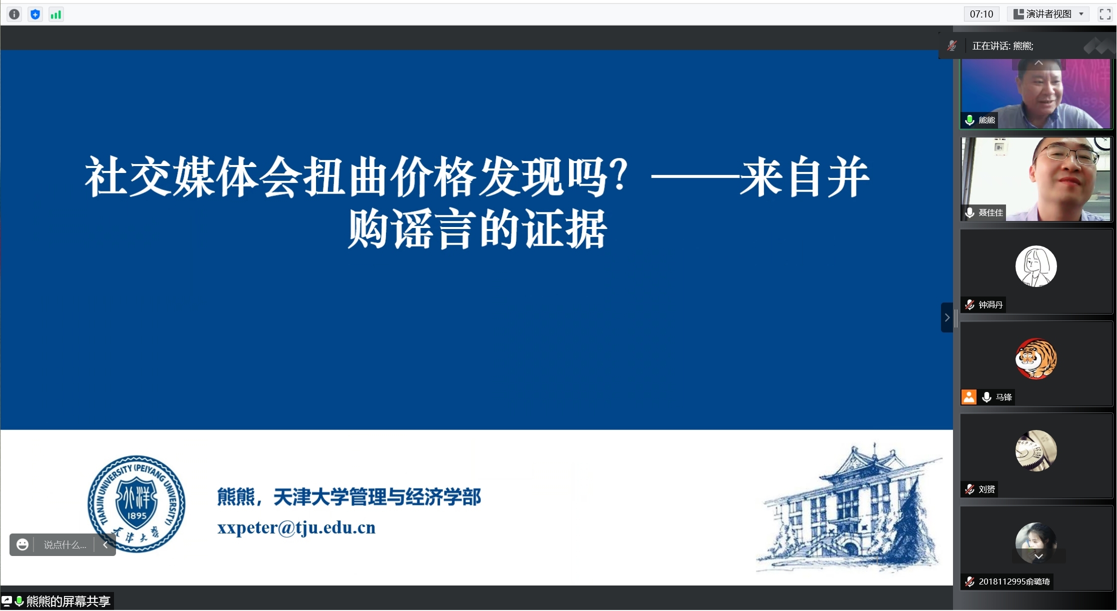 2022年6月16日上午10点,天津大学管理与经济学部熊熊教授应邀以“社交媒体会扭曲价格发现吗?来自并购谣言的证据”为题给冰球官网师生带来一场线上学术讲座。讲座由冰球突破豪华版官方网站副院长聂佳佳教授主持,本次学术活动由学院金融市场与公司金融科研团队承办,金融与财务学系朱宏泉教授、马锋副教授、梁超老师及30余名研究生在线上参加本次学术活动。