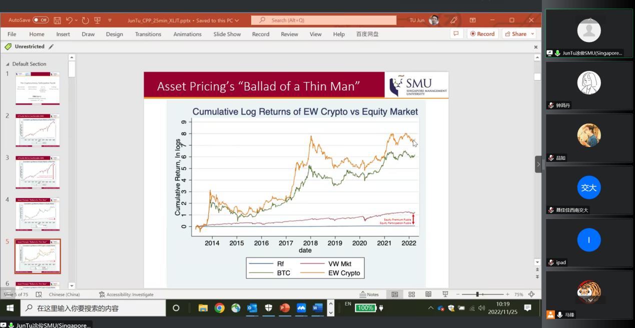 11月25日上午10点,应学院邀请新加坡管理大学凃俊副教授为冰球官网师生以“The Cryptocurrency Participation Puzzle”为主题作线上学术讲座。讲座由副院长聂佳佳教授主持,学院教师及研究生积极参与了本次讲座。