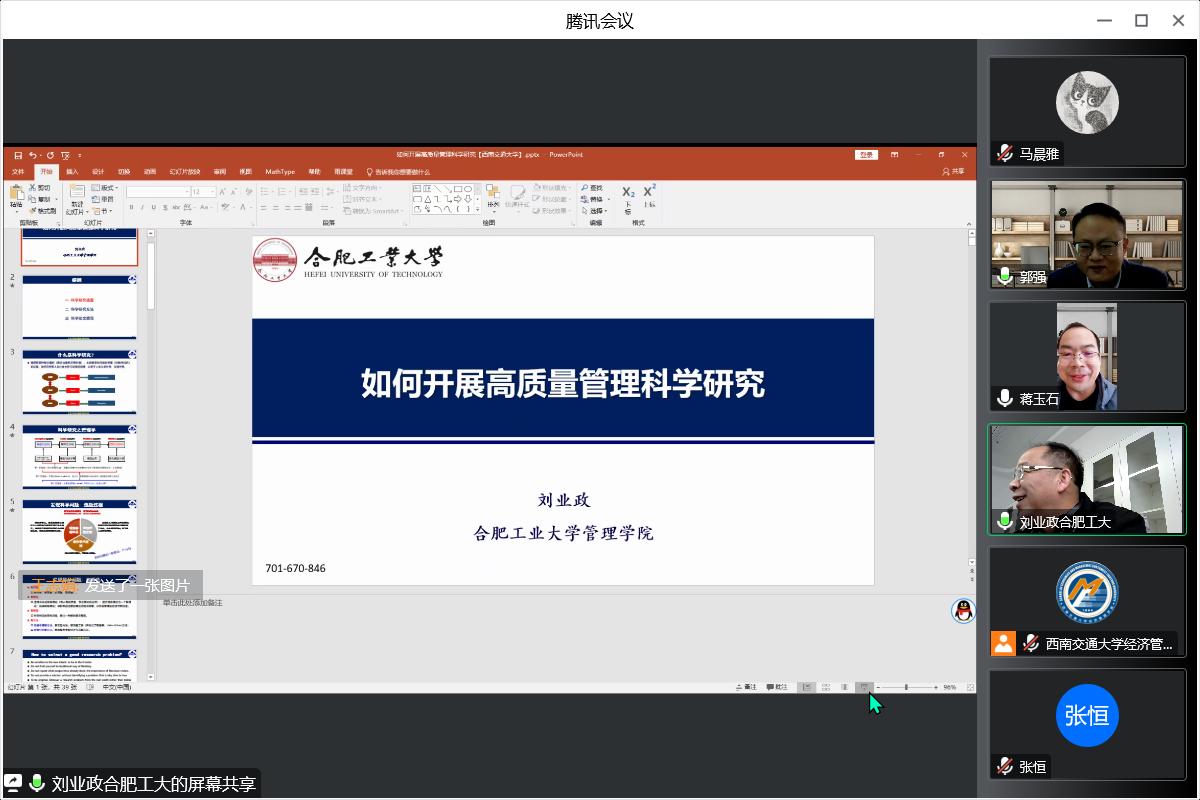 2022年12月10日上午10:00,合肥工业大学管理学院刘业政教授应邀为冰球官网师生带来题为“如何开展高质量管理科学研究”的线上专题讲座。本次学术活动由市场学系蒋玉石教授主持,校内外师生60余人参加了本次讲座。
